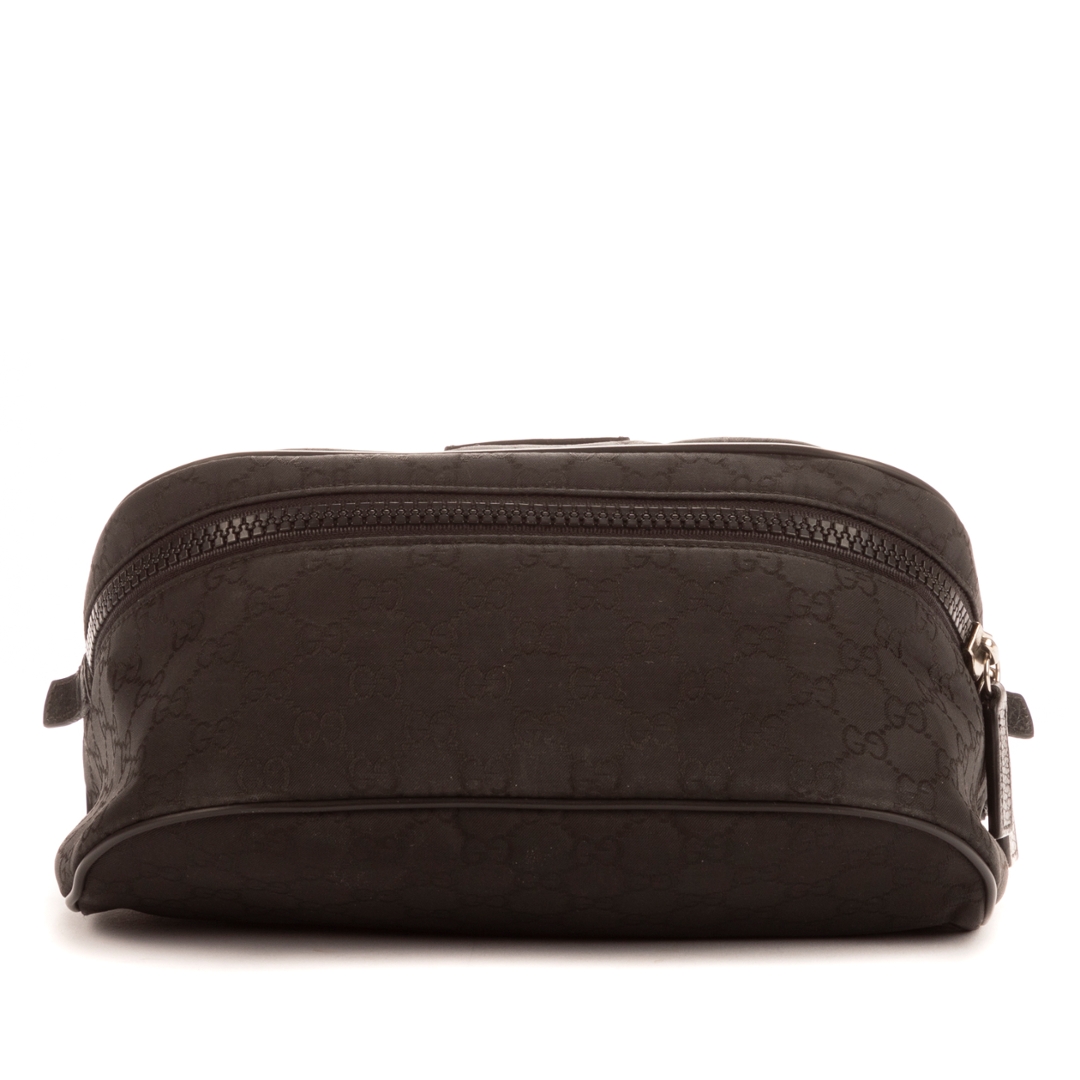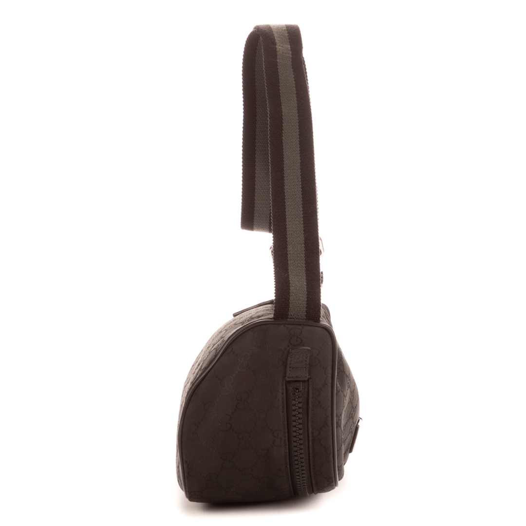 A vintage Gucci black canvas bumbag, featuring the house’s iconic GG monogram subtly woven throughout the fabric. The compact, streamlined silhouette is complemented by tonal leather trim and a discreet Gucci plaque to the front, creating a clean and understated aesthetic. Its minimalist design reflects Gucci’s ability to blend practicality with timeless style.