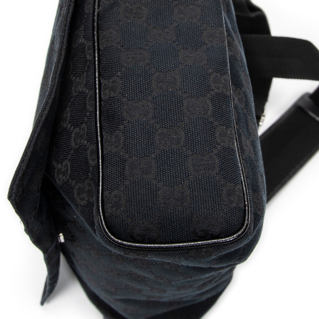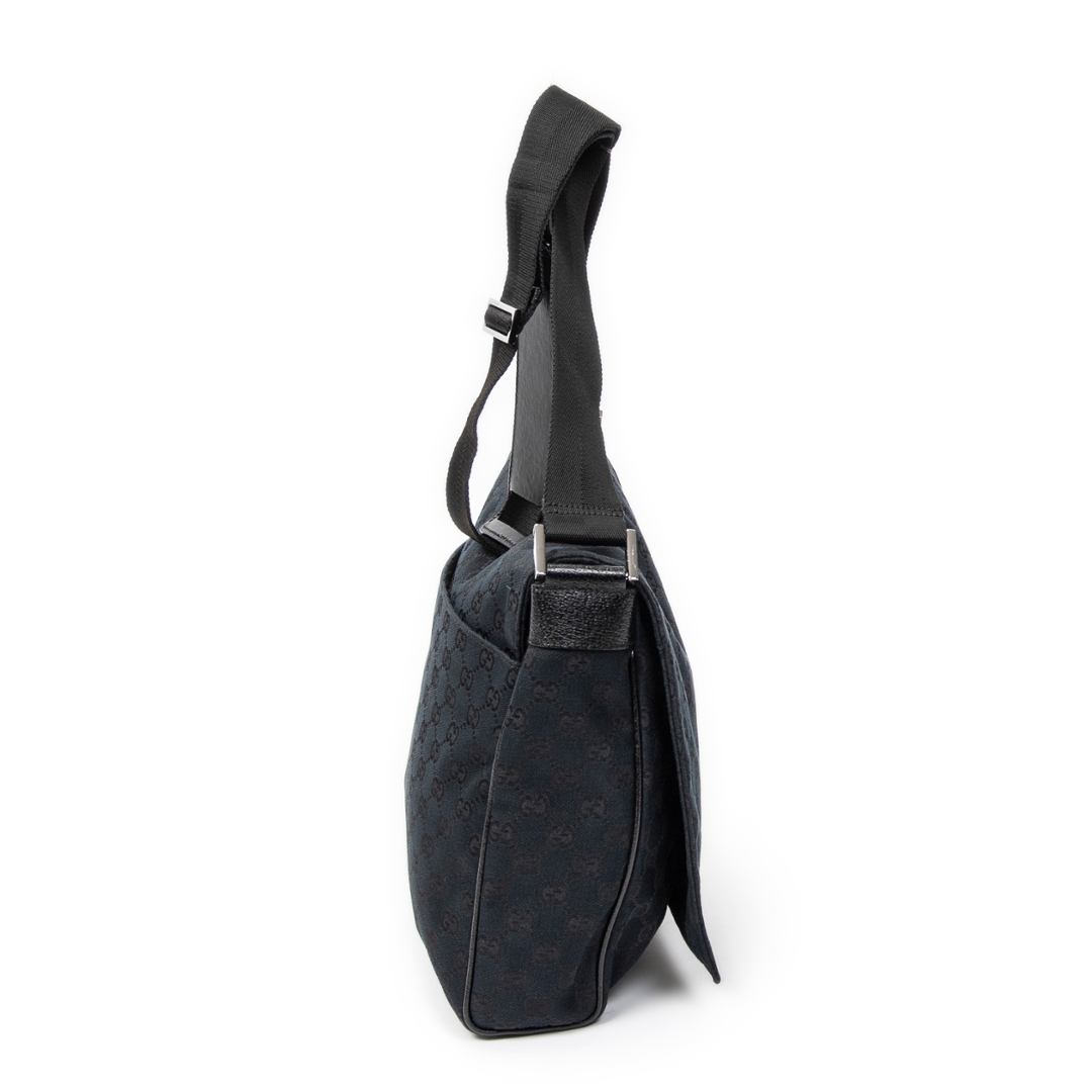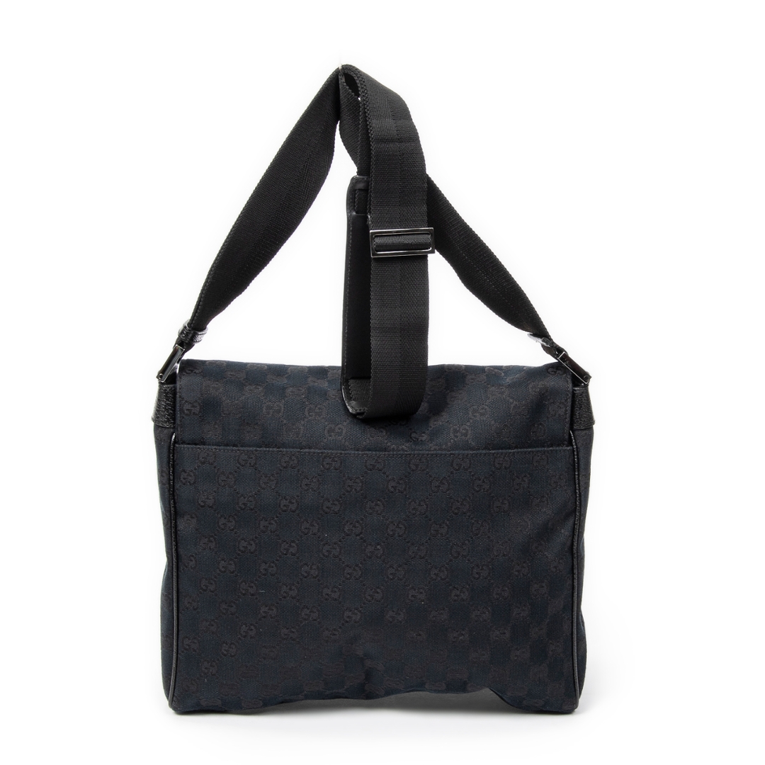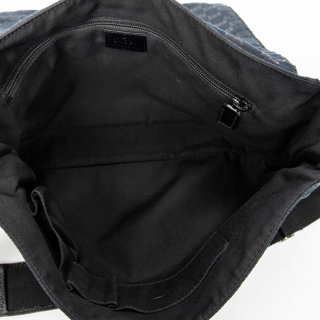 A vintage Gucci black canvas Flap Messenger bag, featuring the house’s signature GG monogram subtly woven throughout the fabric. The structured flap silhouette is complemented by tonal leather trim and understated hardware, creating a clean and timeless aesthetic. A discreet Gucci plaque to the front adds a refined branded touch without overpowering the design.