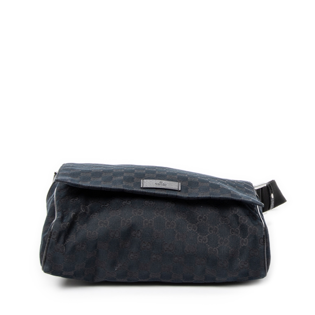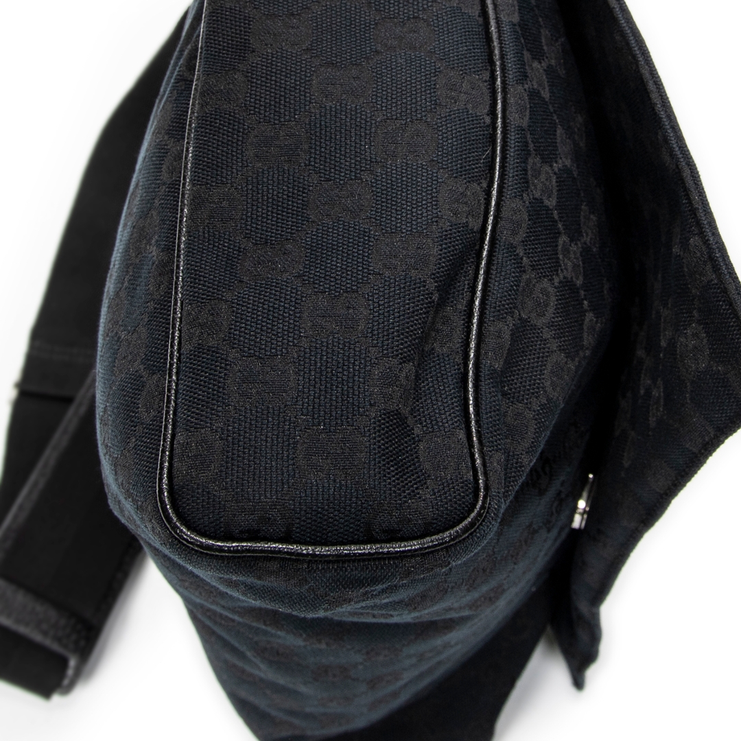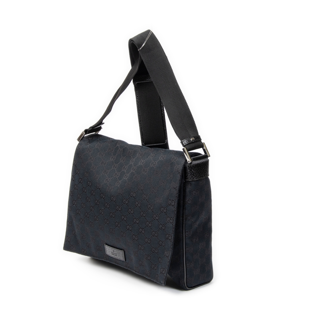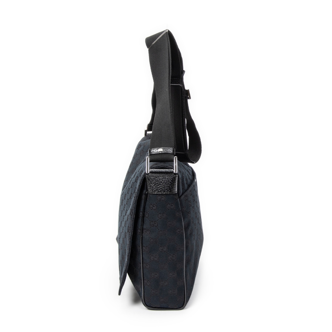 A vintage Gucci black canvas Flap Messenger bag, featuring the house’s signature GG monogram subtly woven throughout the fabric. The structured flap silhouette is complemented by tonal leather trim and understated hardware, creating a clean and timeless aesthetic. A discreet Gucci plaque to the front adds a refined branded touch without overpowering the design.