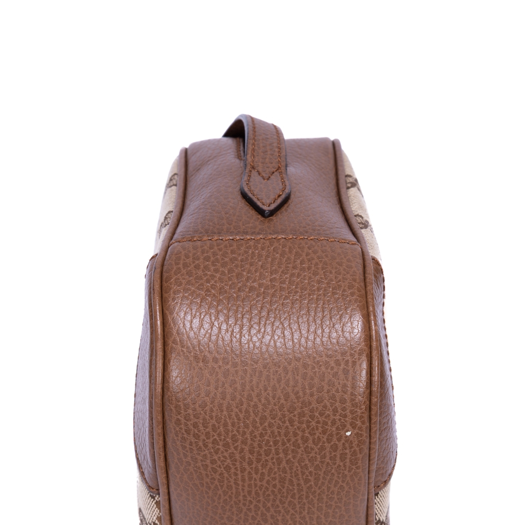 A vintage Gucci brown and beige calf leather GG Canvas Bree Camera bag, showcasing the house’s iconic GG monogram set against a classic neutral canvas. The compact silhouette is complemented by warm brown leather trim, creating a refined contrast that highlights its timeless and recognisable aesthetic. Clean lines and subtle detailing give the piece a polished, versatile finish.