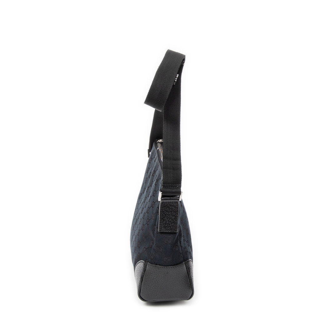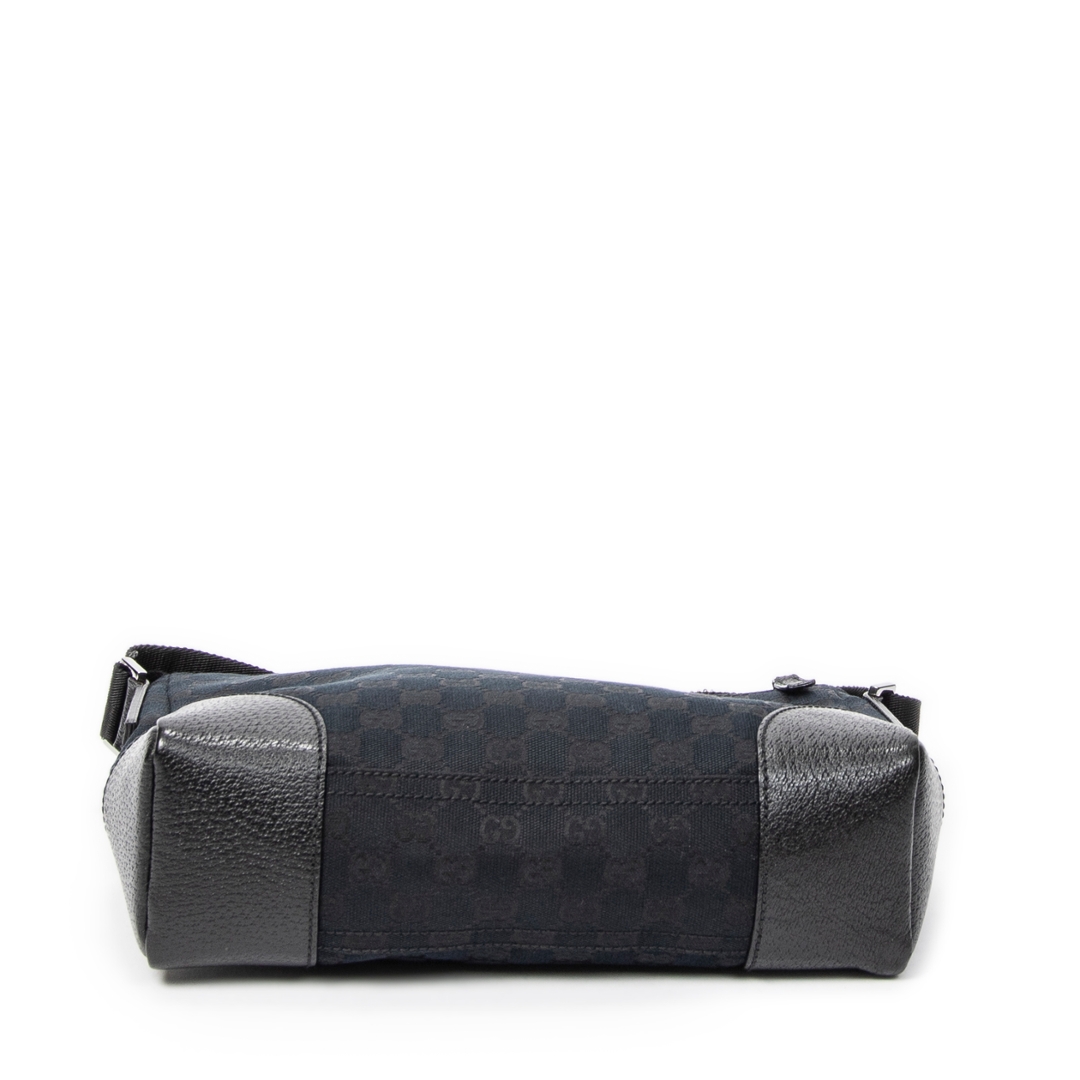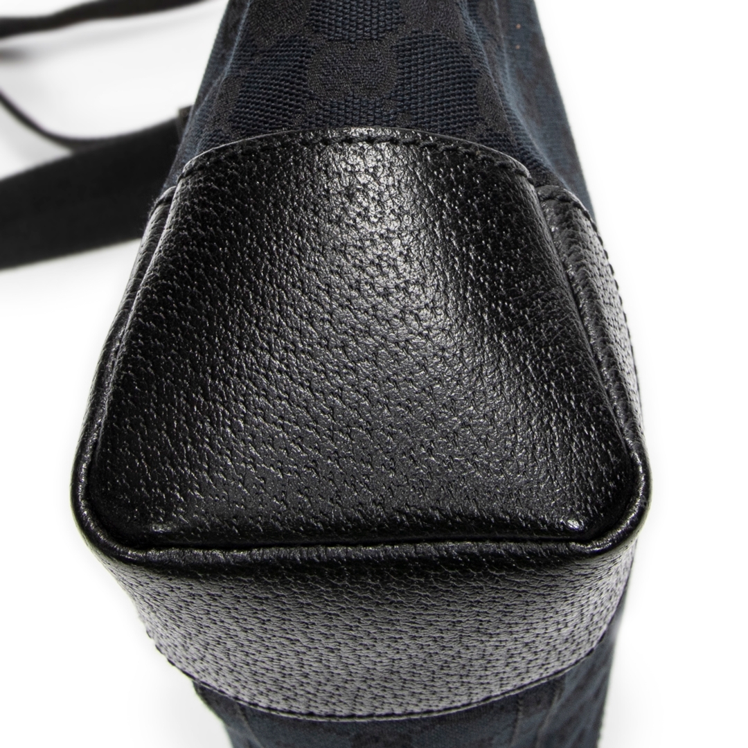 A vintage Gucci black canvas Joy Messenger bag, presenting a sleek and understated take on the house’s iconic GG monogram. The tonal black canvas is complemented by matching leather trim at the corners and edges, creating a refined, minimalist look while maintaining the instantly recognisable Gucci aesthetic.