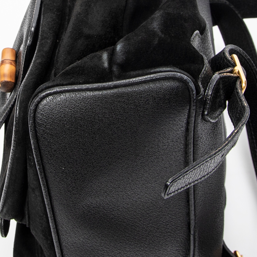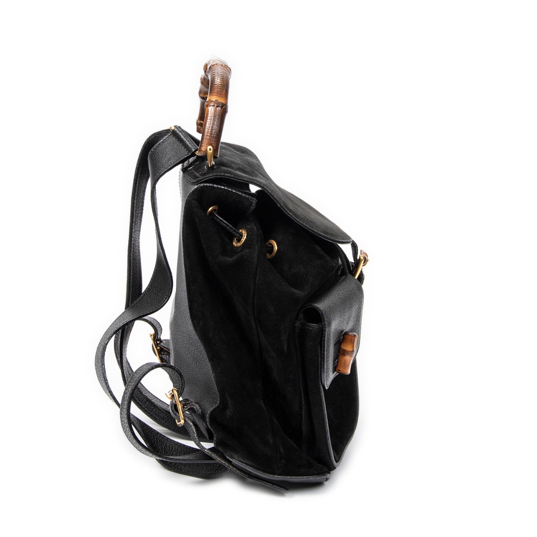A vintage Gucci black calf leather Large Bamboo Backpack bag with a certificate of authenticity, Approximately 20cm height, 20m width.