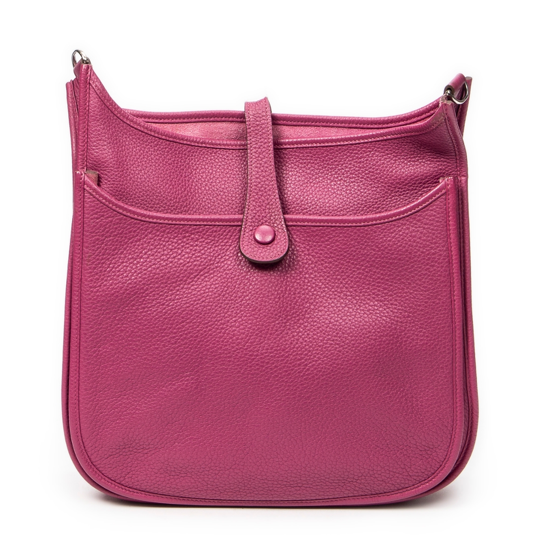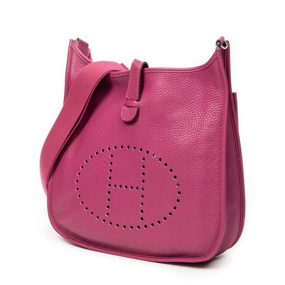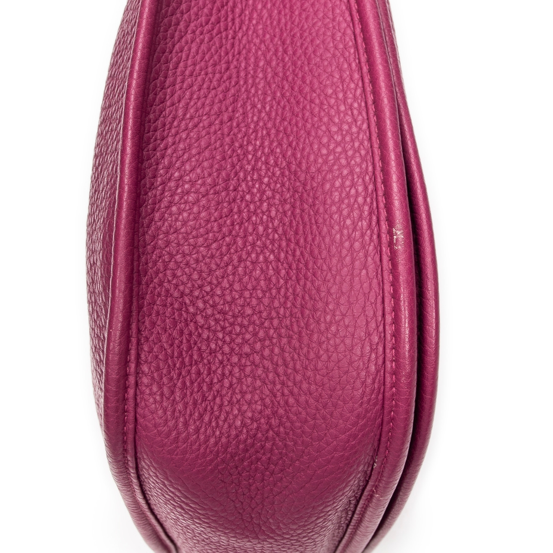 A Hermès Evelyne III bag crafted in rich anemone Clemence calf leather, showcasing the house’s iconic perforated “H” logo to the front. The softly structured silhouette is complemented by refined leather trim and palladium-tone hardware, while the deep pink-purple hue delivers a bold yet elegant presence. The natural grain of Clemence leather enhances both durability and texture, reinforcing its luxurious appeal.
