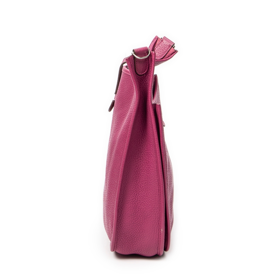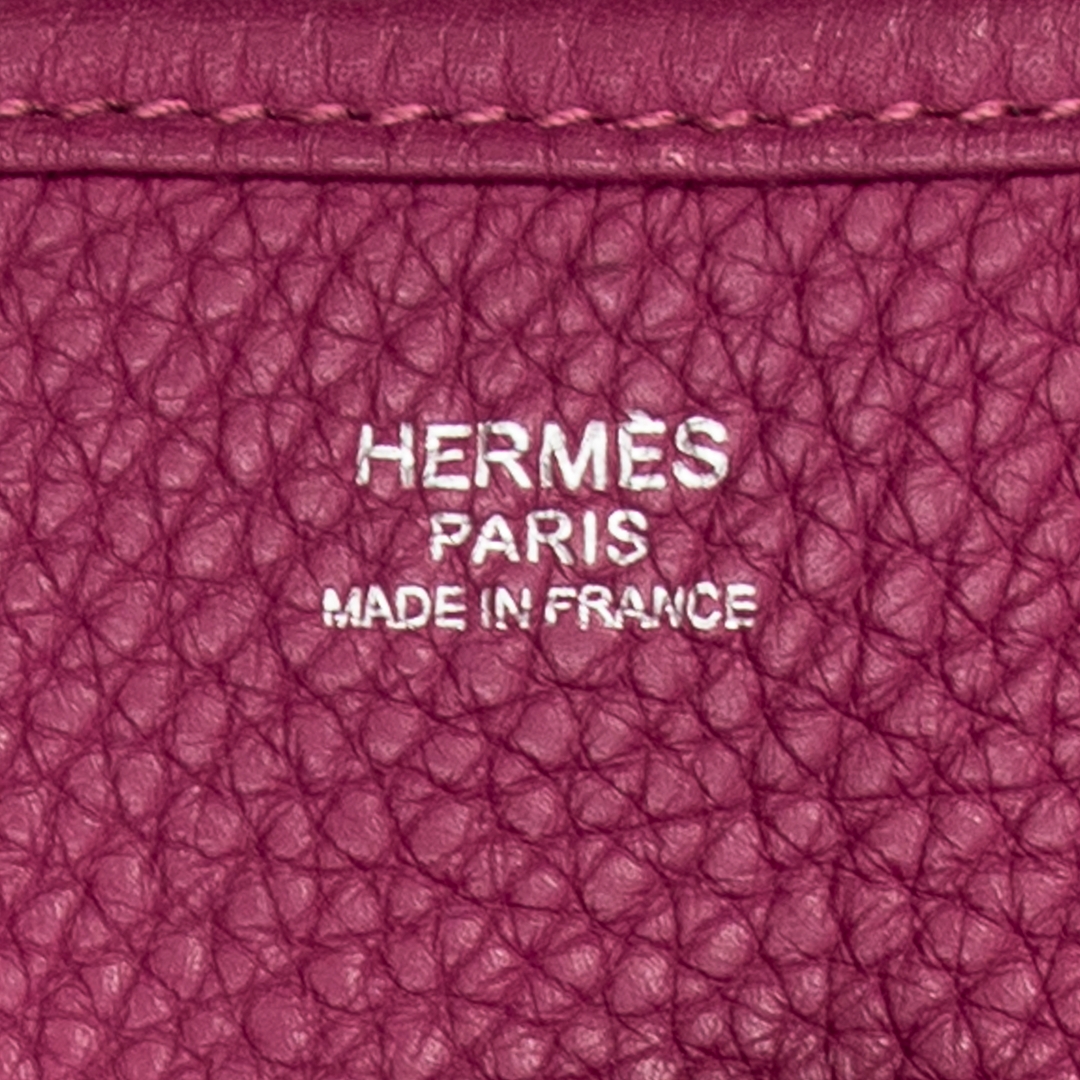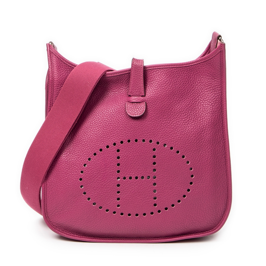 A Hermès Evelyne III bag crafted in rich anemone Clemence calf leather, showcasing the house’s iconic perforated “H” logo to the front. The softly structured silhouette is complemented by refined leather trim and palladium-tone hardware, while the deep pink-purple hue delivers a bold yet elegant presence. The natural grain of Clemence leather enhances both durability and texture, reinforcing its luxurious appeal.