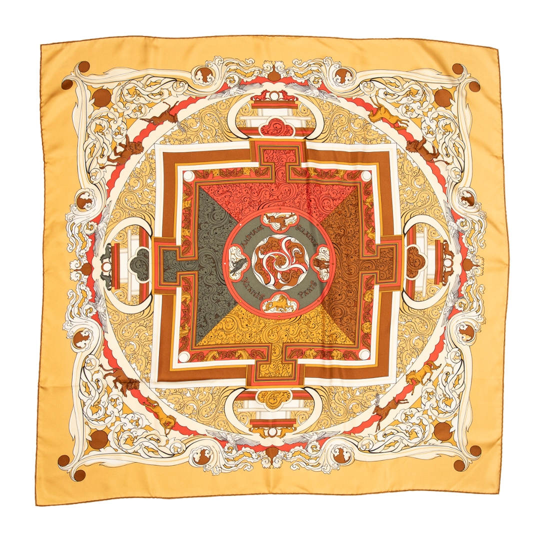 A vintage Hermes beige/brown silk Scarf with a certificate of authenticity, Approx 90cm height, 90cm width.