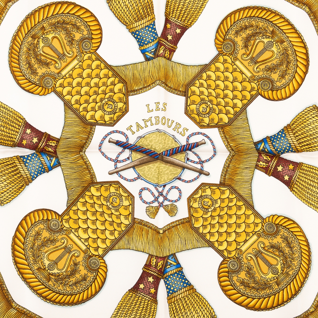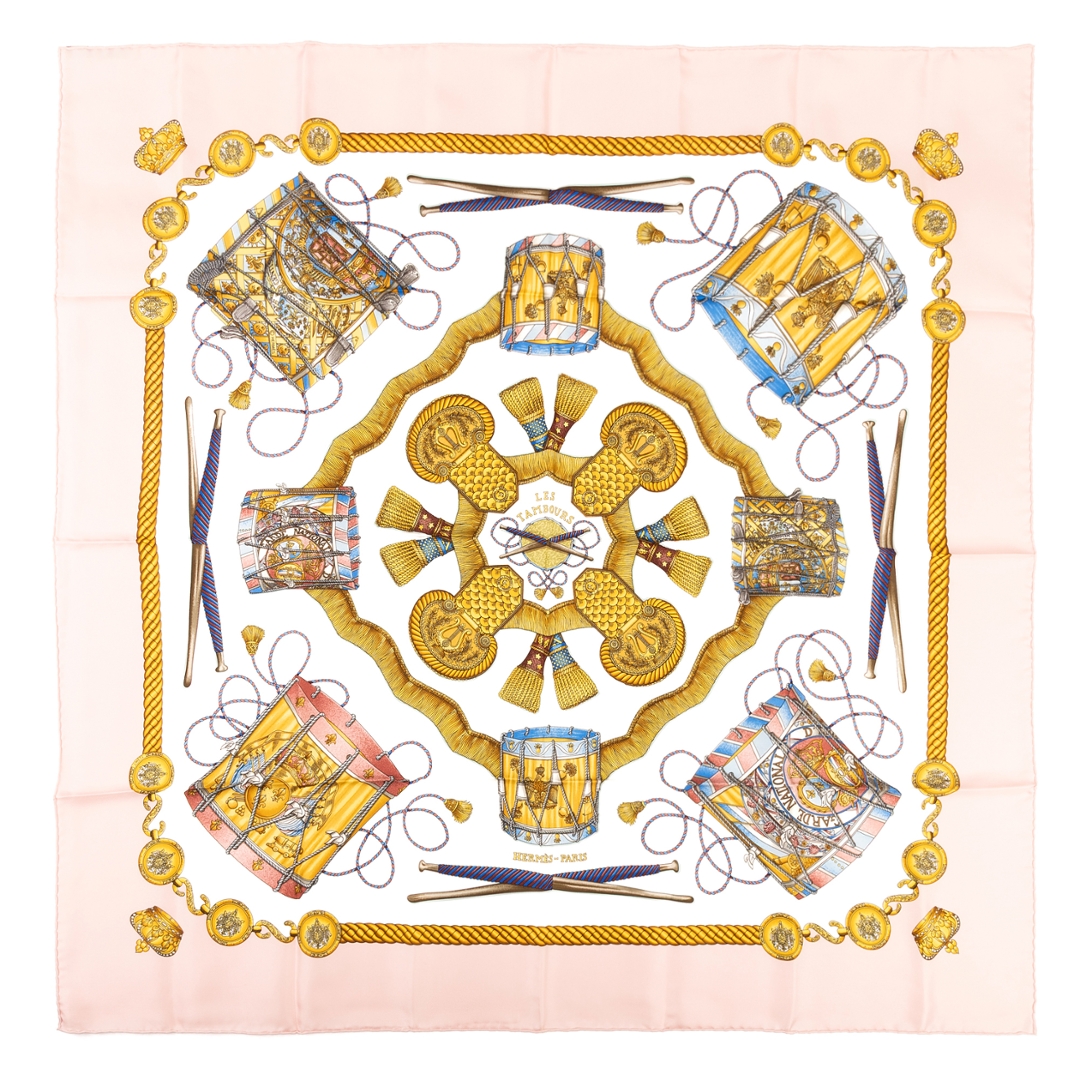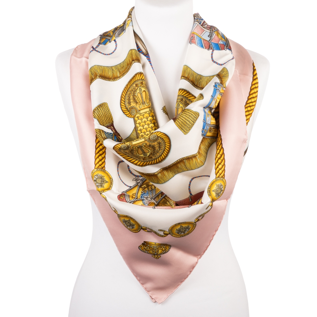 A vintage Hermès light pink and gold silk scarf for those who value timeless elegance and masterful design. Hermès scarves are celebrated worldwide for their artistry and luxurious craftsmanship, and this piece is a striking example. The design features intricate golden motifs set against a crisp white backdrop, framed with a soft light pink border that adds a feminine and refined touch.