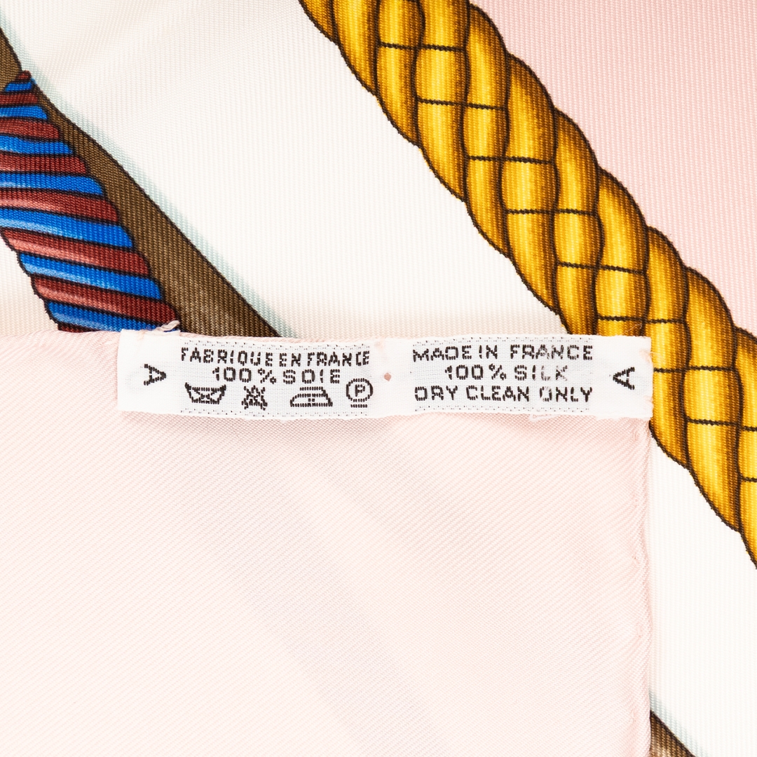 A vintage Hermes light pink/gold silk Scarf with a certificate of authenticity, Approx 90cm height, 90cm width.