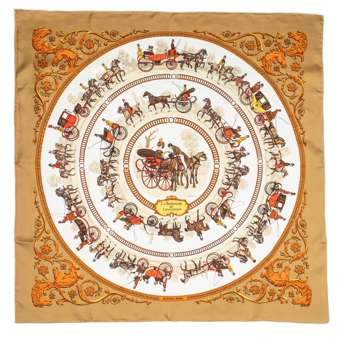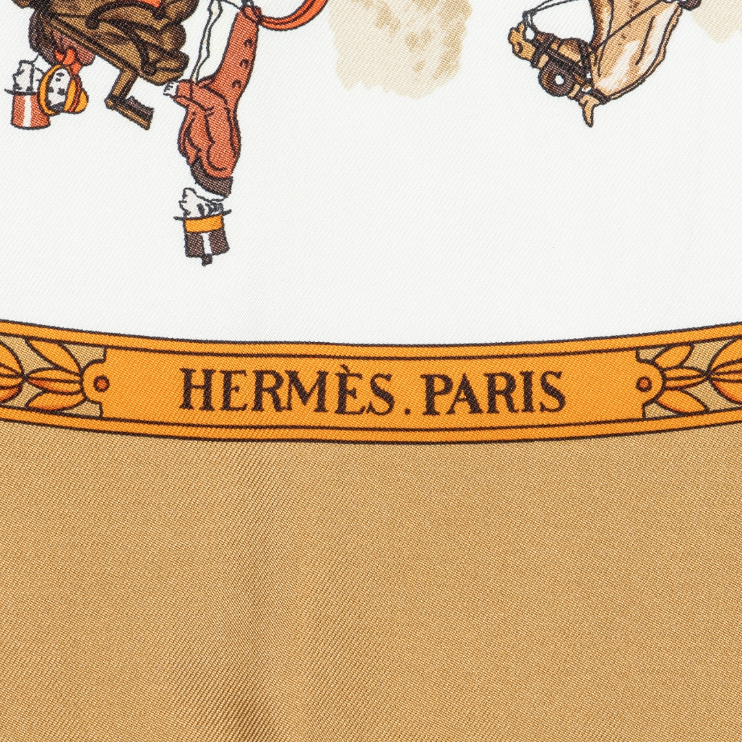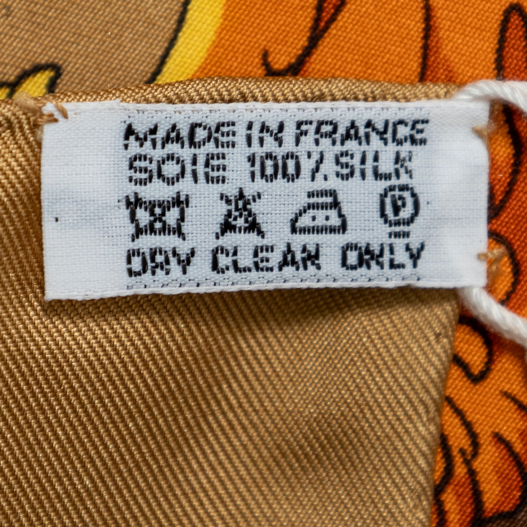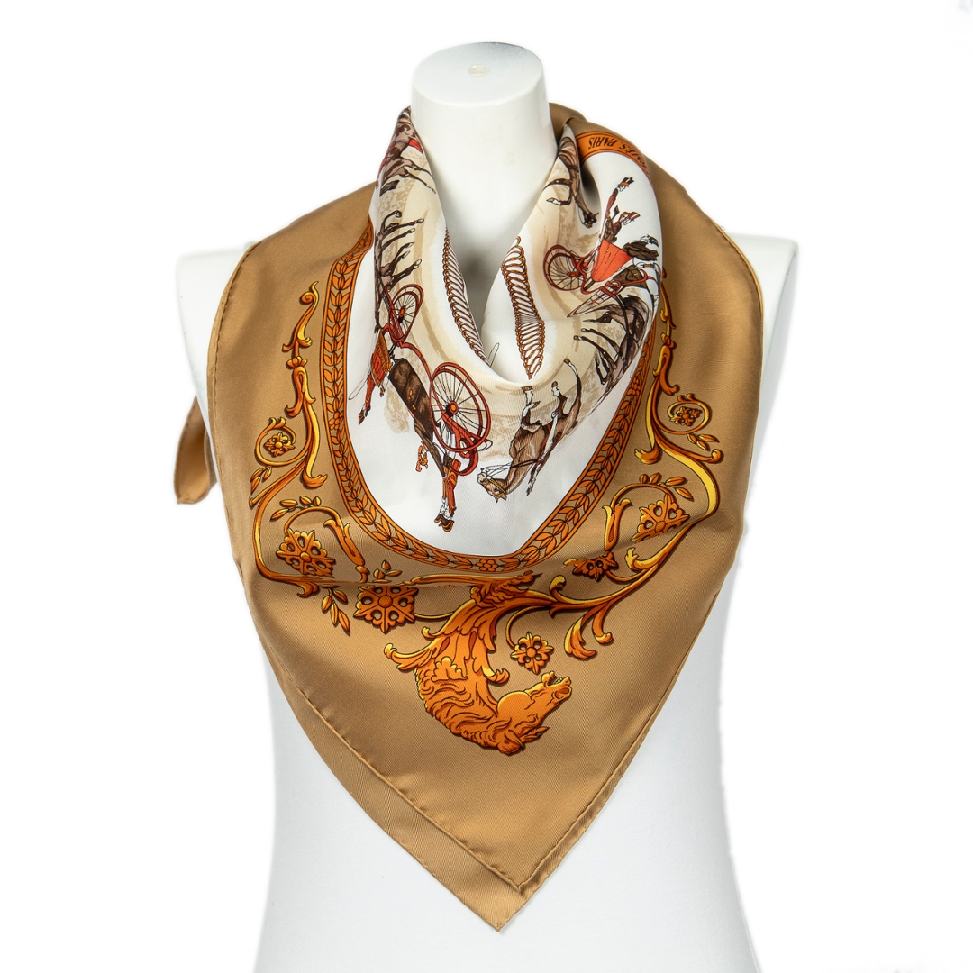 A vintage Hermès gold and brown silk scarf for those who admire timeless artistry and refined luxury. Hermès has long been celebrated for its iconic silk scarves, each piece a wearable work of art that showcases exceptional craftsmanship. This design features intricate motifs in warm gold and rich brown tones, enhanced with elegant detailing and subtle accents that highlight the maison’s mastery of colour and composition.