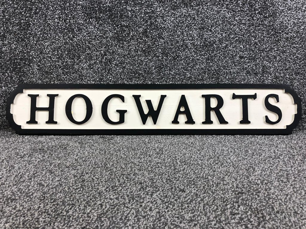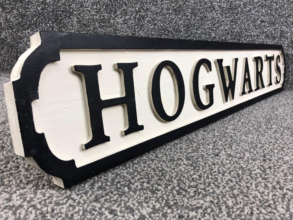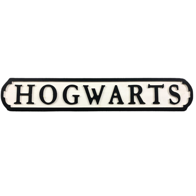 Crafted with meticulous attention to detail, the sign features bold lettering against a backdrop reminiscent of the ancient stone walls of Hogwarts Castle. The name "Hogwarts" is prominently displayed, invoking images of towering turrets, winding staircases, and magical adventures.