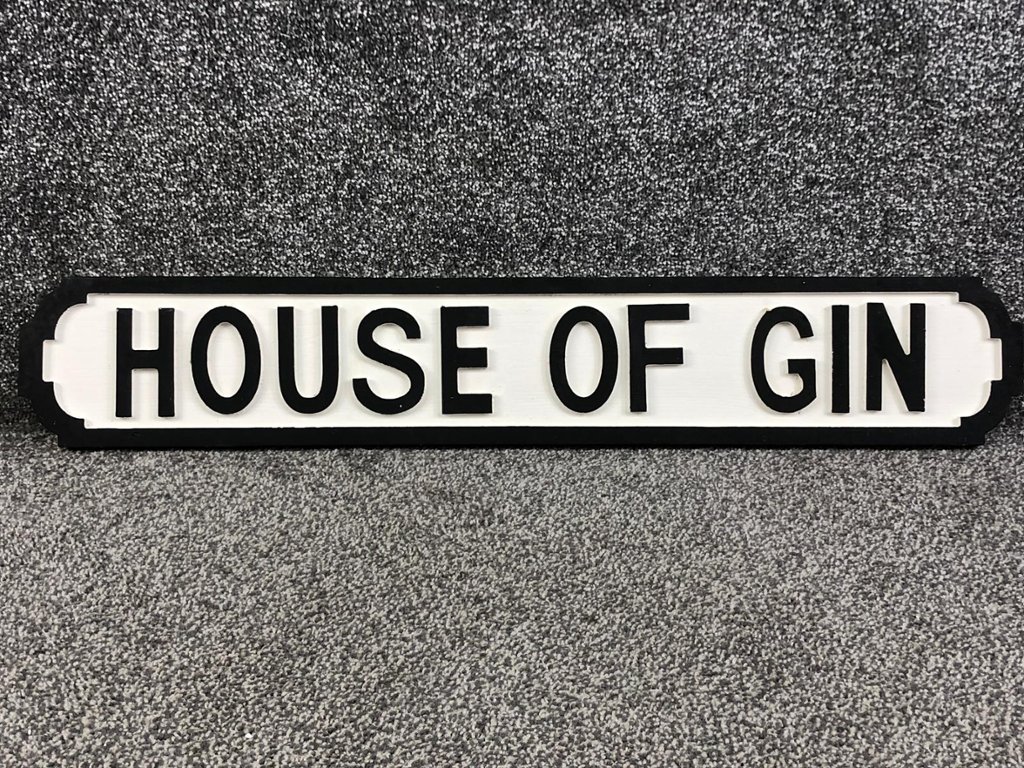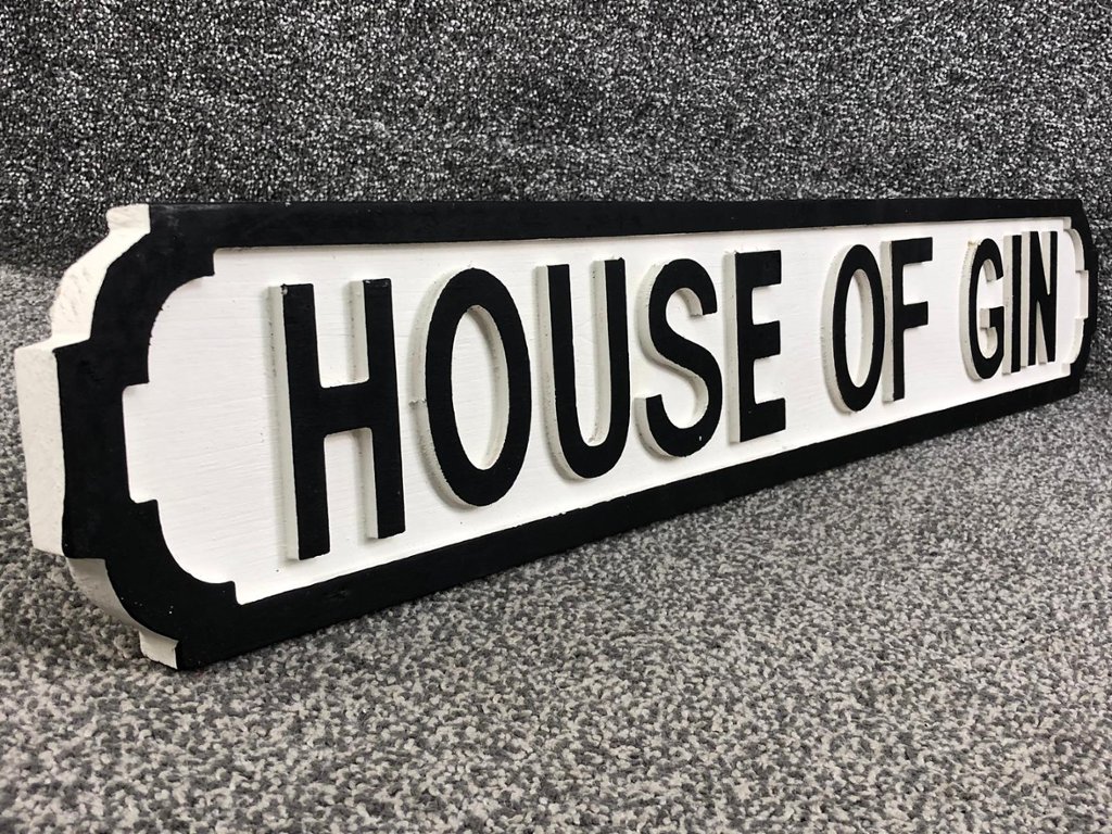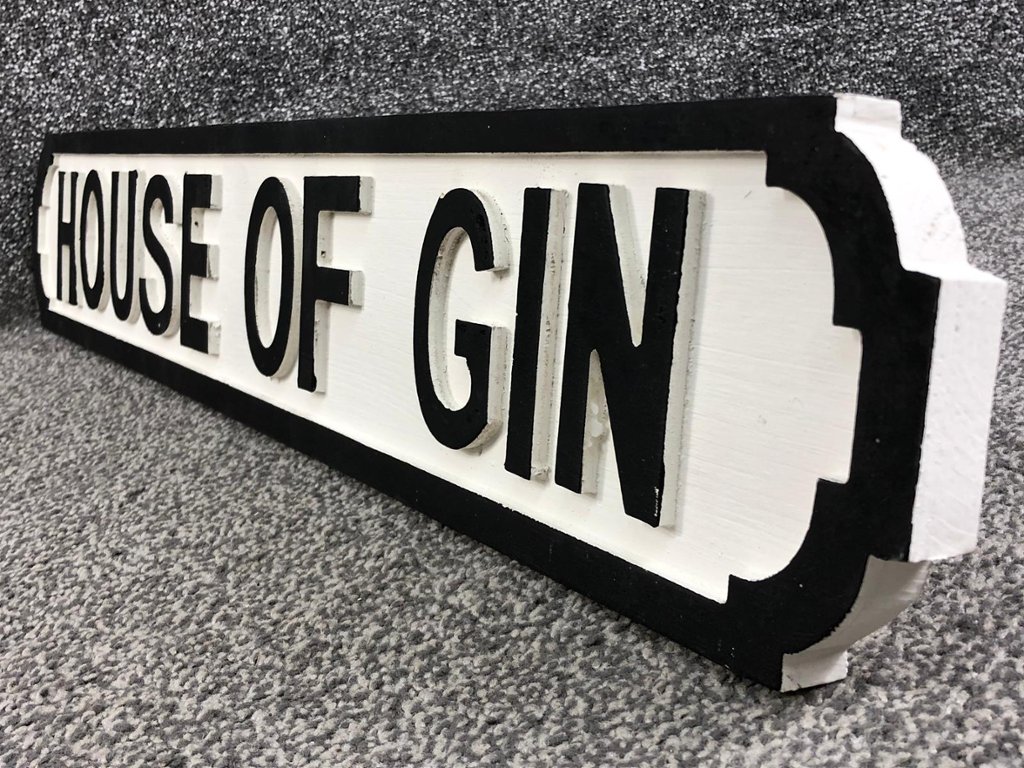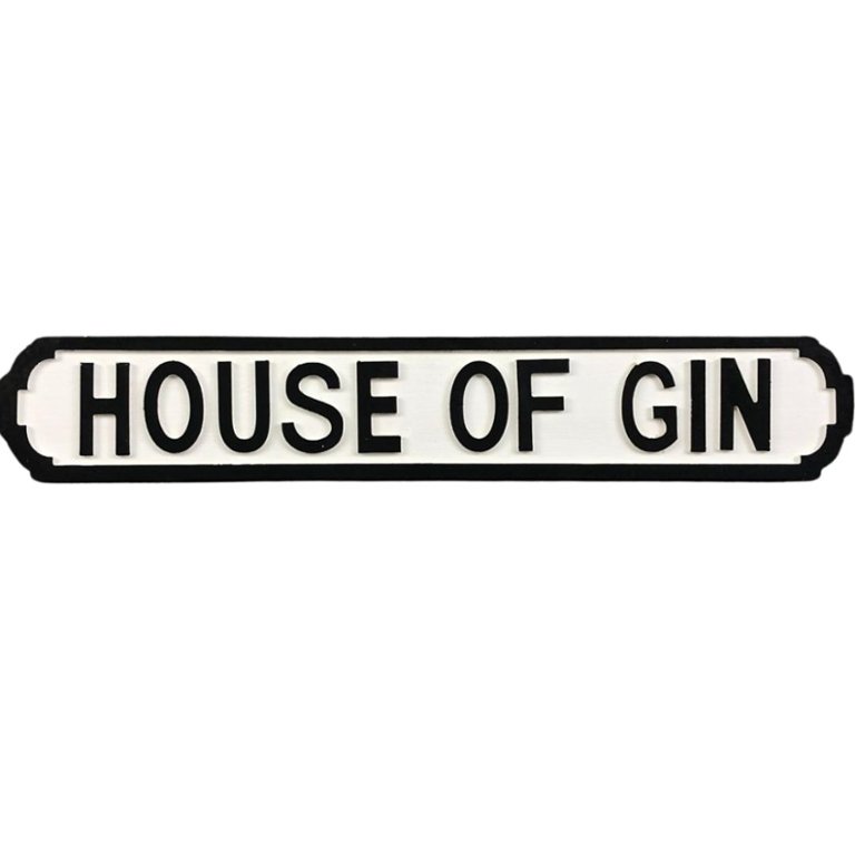 A street sign titled 'House of Gin'. Approx 6" height, 31" width.