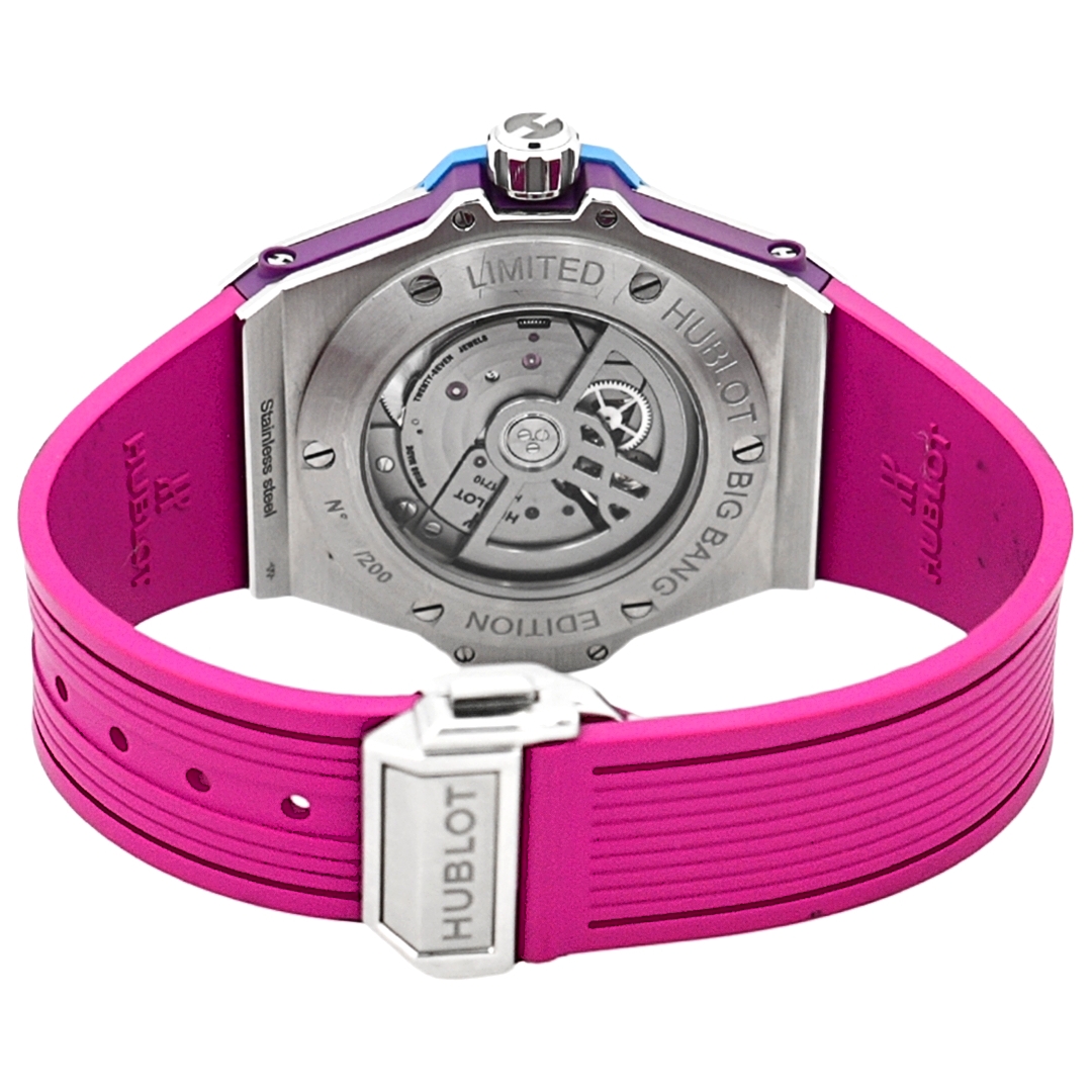 The factory-set amethyst bezel elevates this piece beyond conventional sports luxury, with each gemstone precisely selected and matched for rich violet tone and consistent brilliance. The contrast between the vibrant pink dial and the cool purple amethysts creates a striking, collectable aesthetic that defines the Pop Art series. As a limited and highly recognisable variation within the Big Bang One Click line, gemstone-set examples continue to attract strong demand from collectors seeking individuality and rarity.