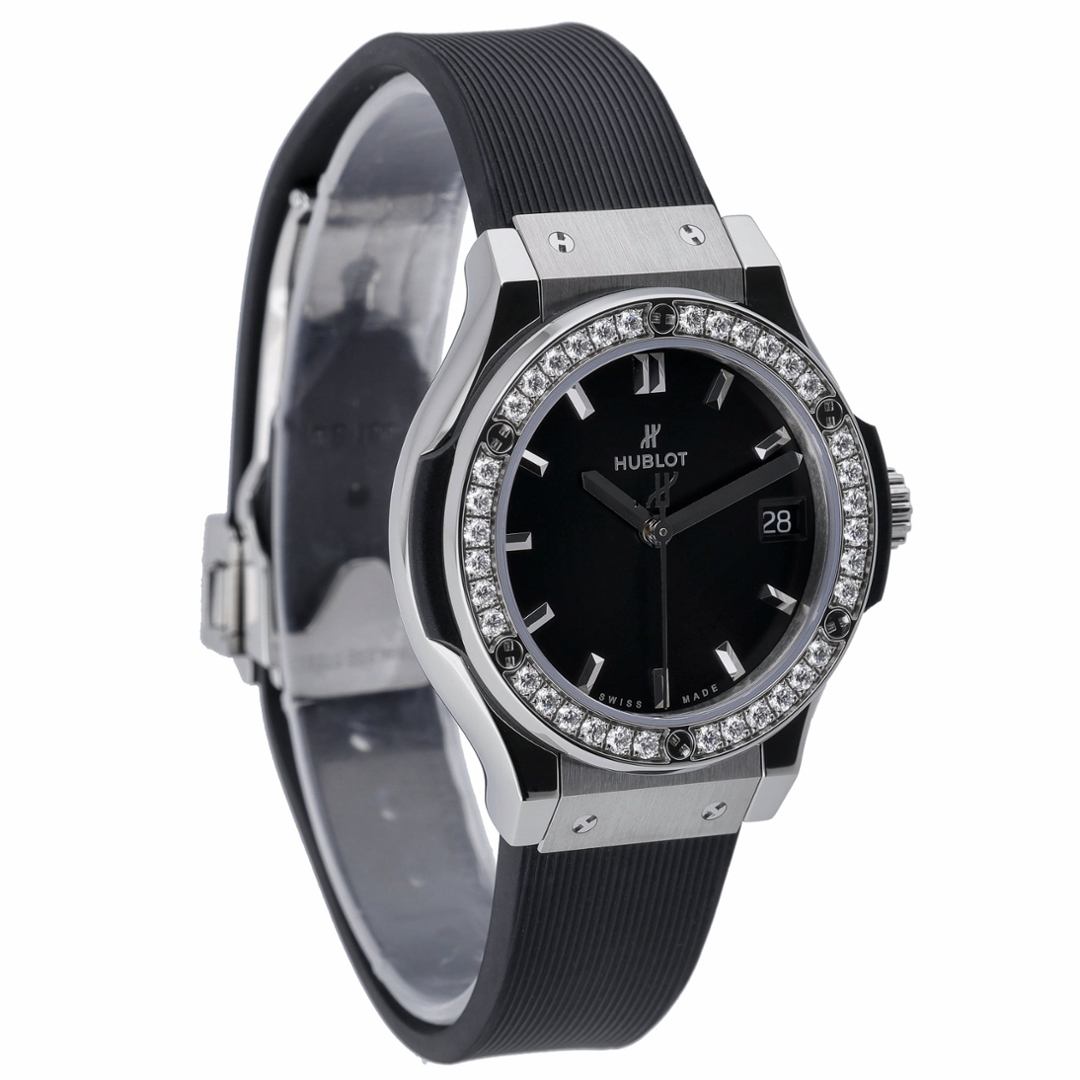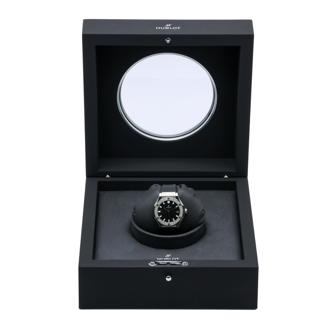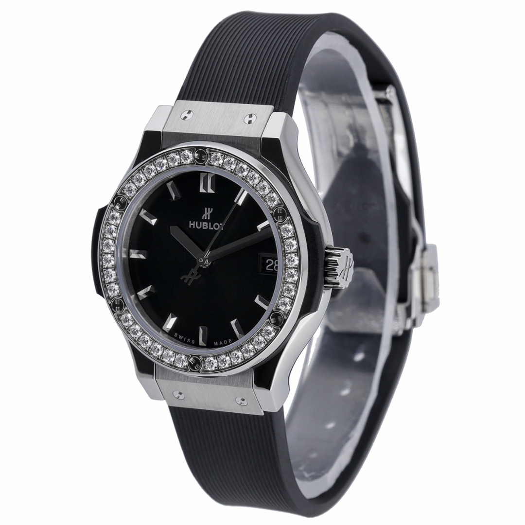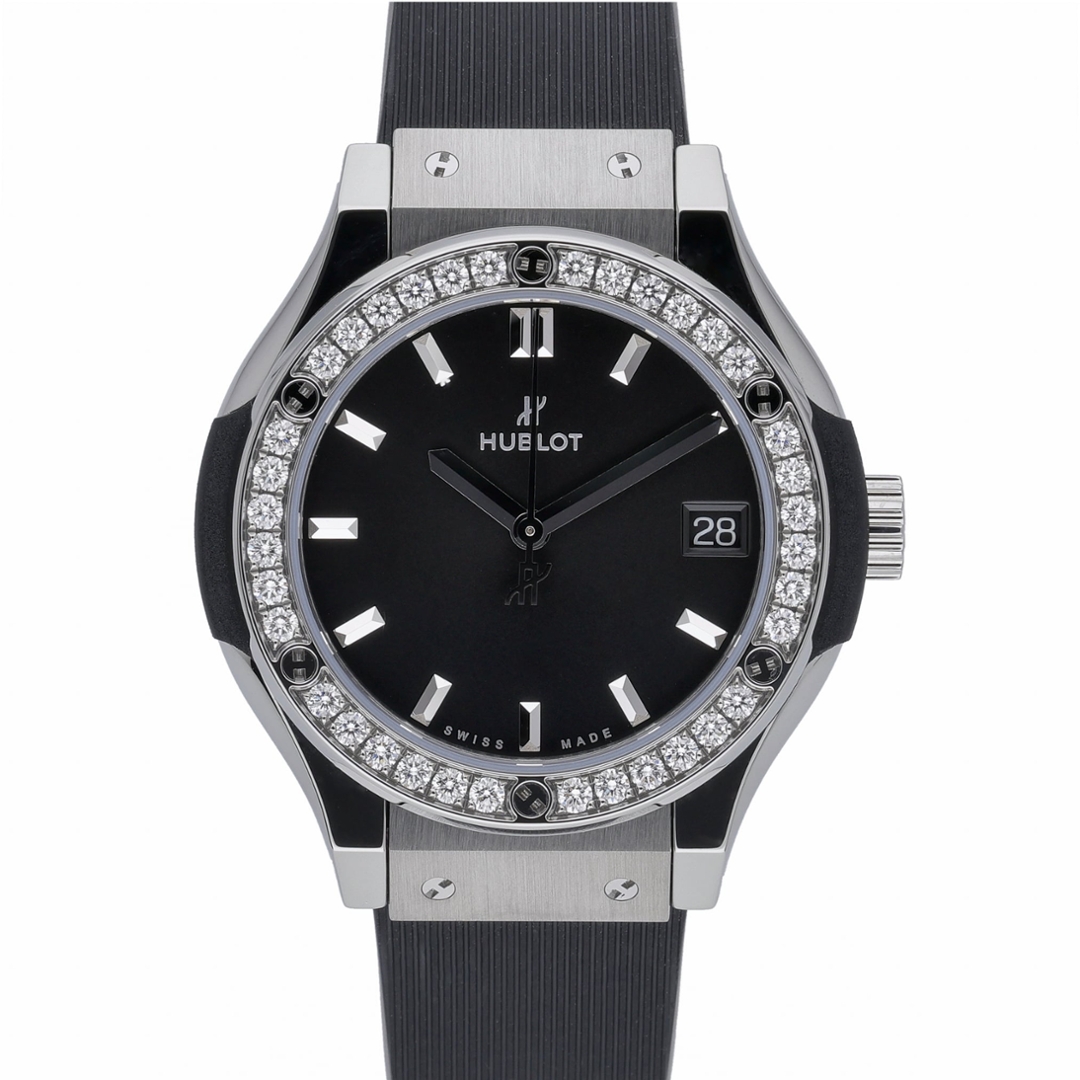 A Hublot Classic Fusion Quartz, reference 581.NX.1470.RX.1104, combining Hublot’s clean, contemporary design with refined luxury detailing. The 33mm titanium case offers a lightweight yet durable profile, framed by a factory-set diamond bezel that adds understated brilliance against the black dial.