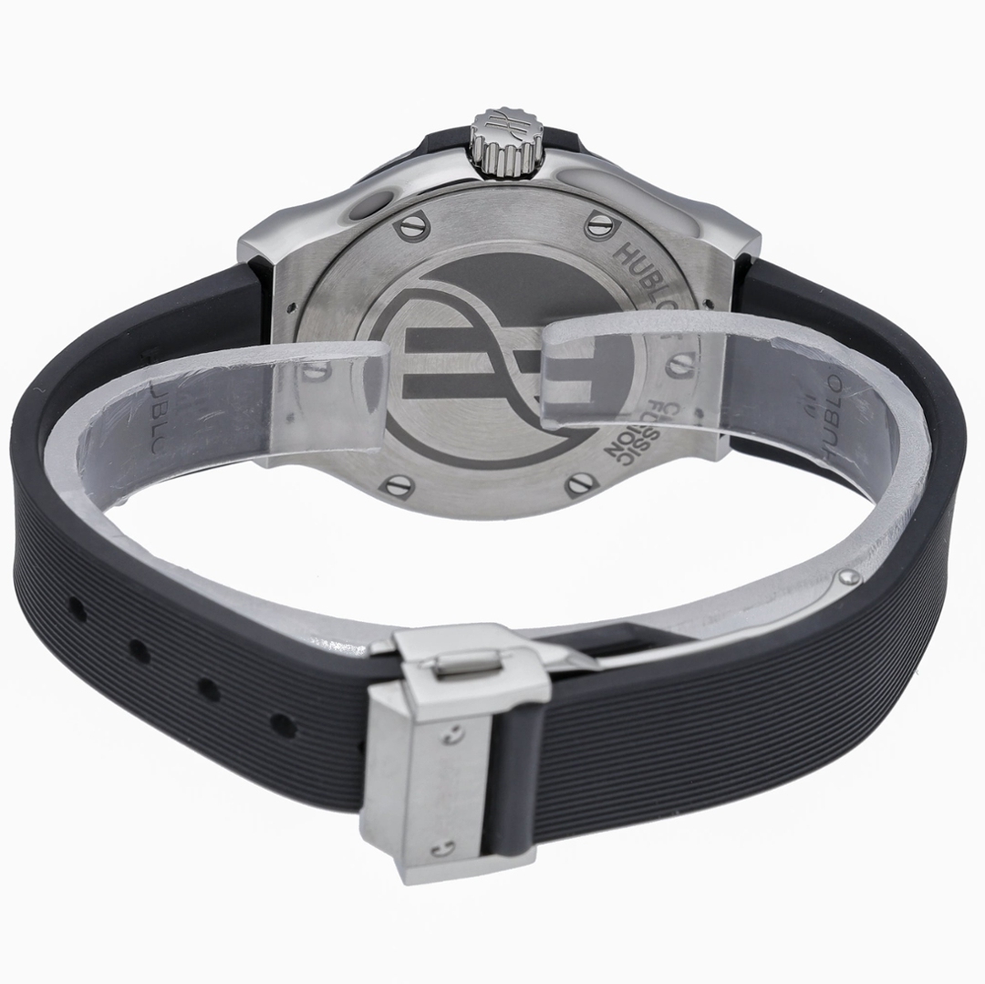 The watch is powered by a reliable Swiss quartz movement, ensuring precise timekeeping with minimal maintenance. The black rubber strap enhances everyday wearability while remaining unmistakably Hublot in character.