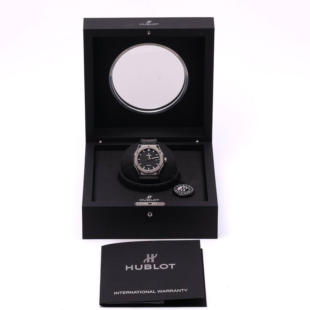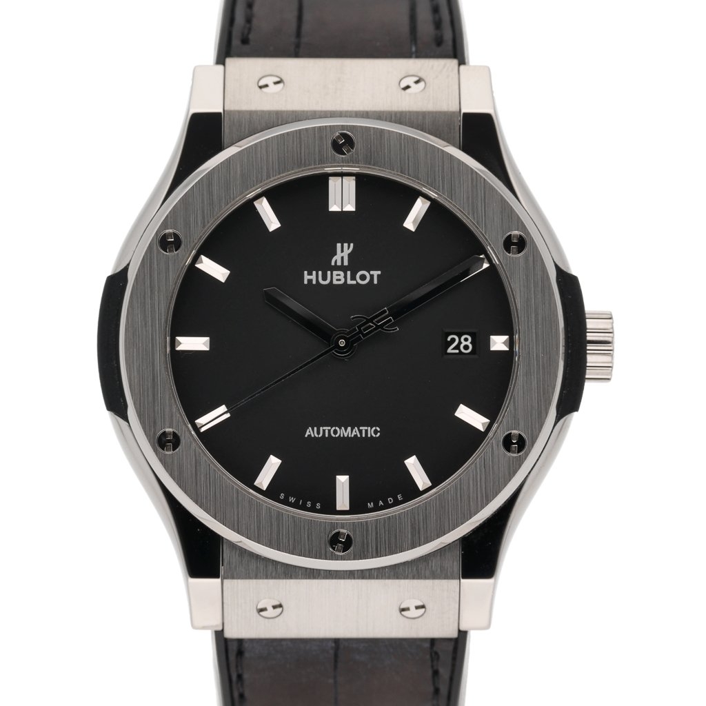 A Hublot Classic Fusion Watch, model reference 542.NX.1171.LR, effortlessly combines understated elegance with modern engineering. Crafted with a 42mm titanium case, this lightweight yet durable timepiece features Hublot’s signature minimalist aesthetic. The black sunray satin-finished dial is adorned with rhodium-plated baton hour markers and hands, complemented by a date aperture at 3 o’clock for practical functionality.