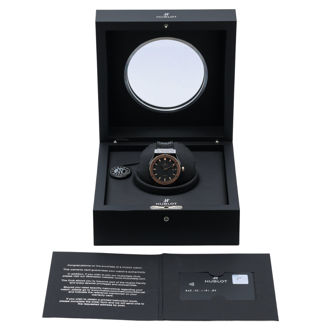 Inside, this watch houses Hublot’s reliable HUB1110 automatic movement, offering a 42-hour power reserve and precision worthy of Swiss horological excellence. The black leather strap, secured by an 18ct King Gold and titanium clasp, ensures both comfort and durability, making it suitable for both everyday wear and formal occasions.
