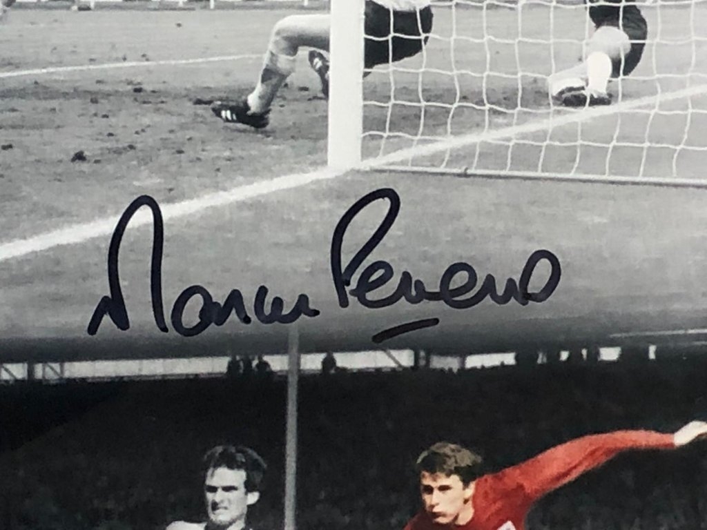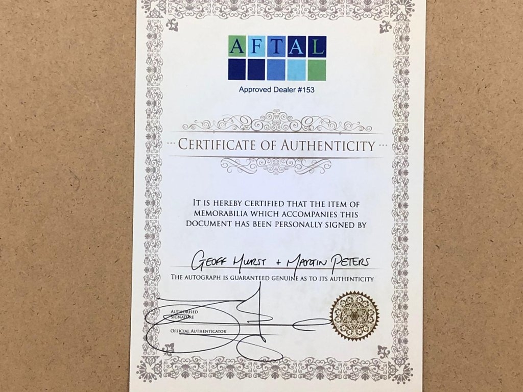 The piece is hand-signed by both Geoff Hurst and Martin Peters,