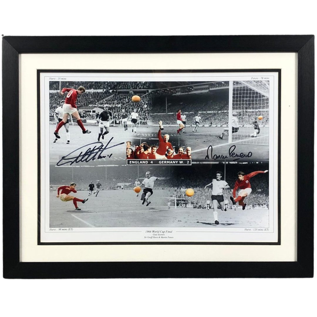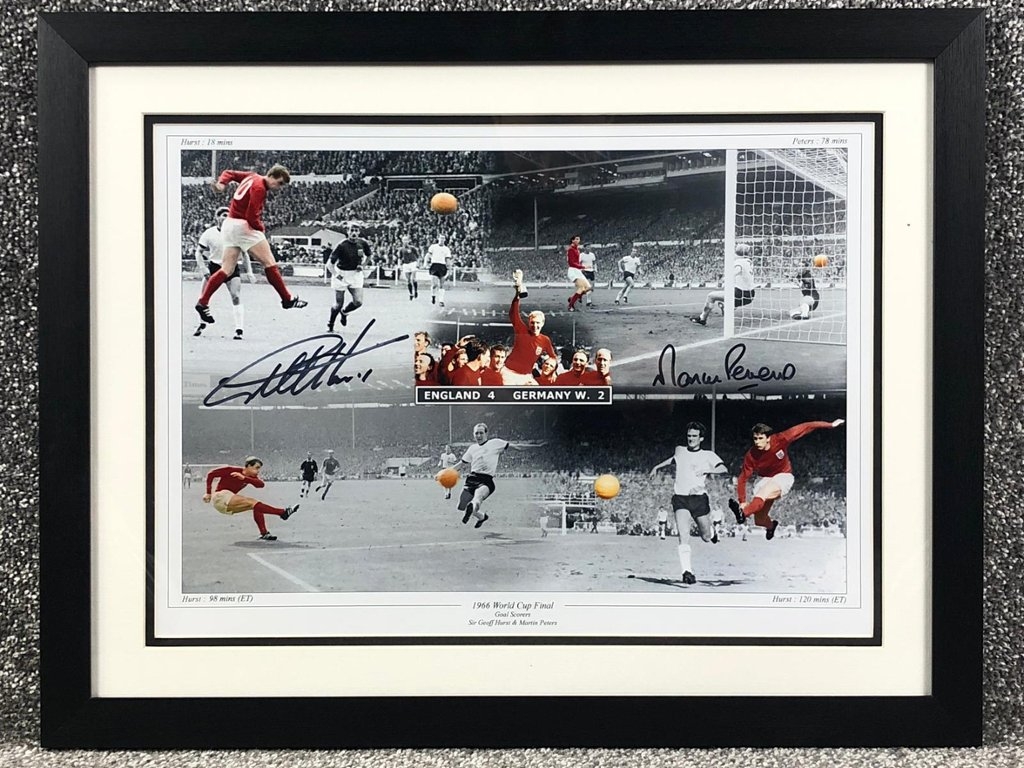A signed and authenticated Geoff Hurst and Martin Peters England 1966 picture montage in a presentation frame. Approx 41cm height, 53cm width.