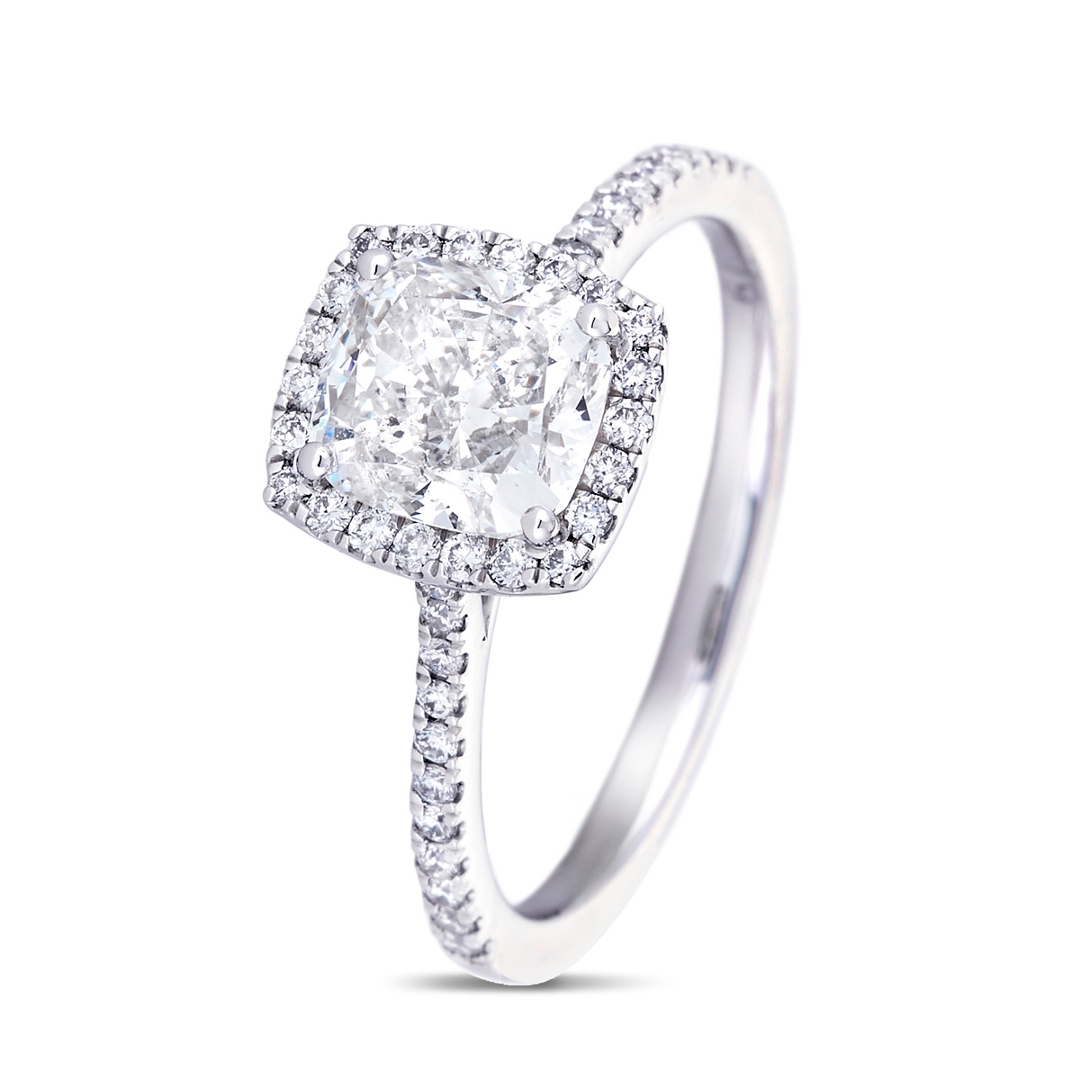 A brand new, unused IGI-certified natural diamond solitaire engagement ring set with one cushion-cut diamond to the centre & a cluster of brilliant cut diamonds in a halo setting & to the shoulders, set in platinum.