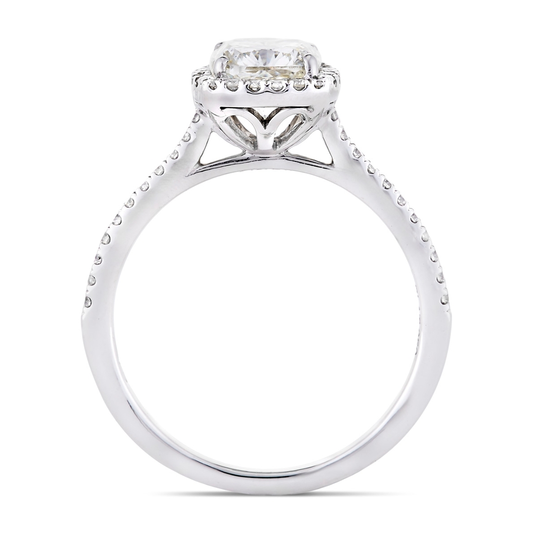 A brand new, unused IGI-certified platinum engagement ring, this exquisite piece is a breathtaking showcase of natural diamond beauty. At its centre is a 1.50ct cushion-cut diamond, graded I colour, SI2 clarity, with a generous spread and soft, romantic brilliance. Surrounding the centrepiece is a sparkling halo of brilliant-cut diamonds, with additional stones set along the shoulders. These accents total 0.21ct and are graded SI1–SI2 clarity and G–H colour, enhancing the central diamond’s glow with a graceful, continuous shimmer. The platinum setting adds a refined, modern elegance and enduring strength.