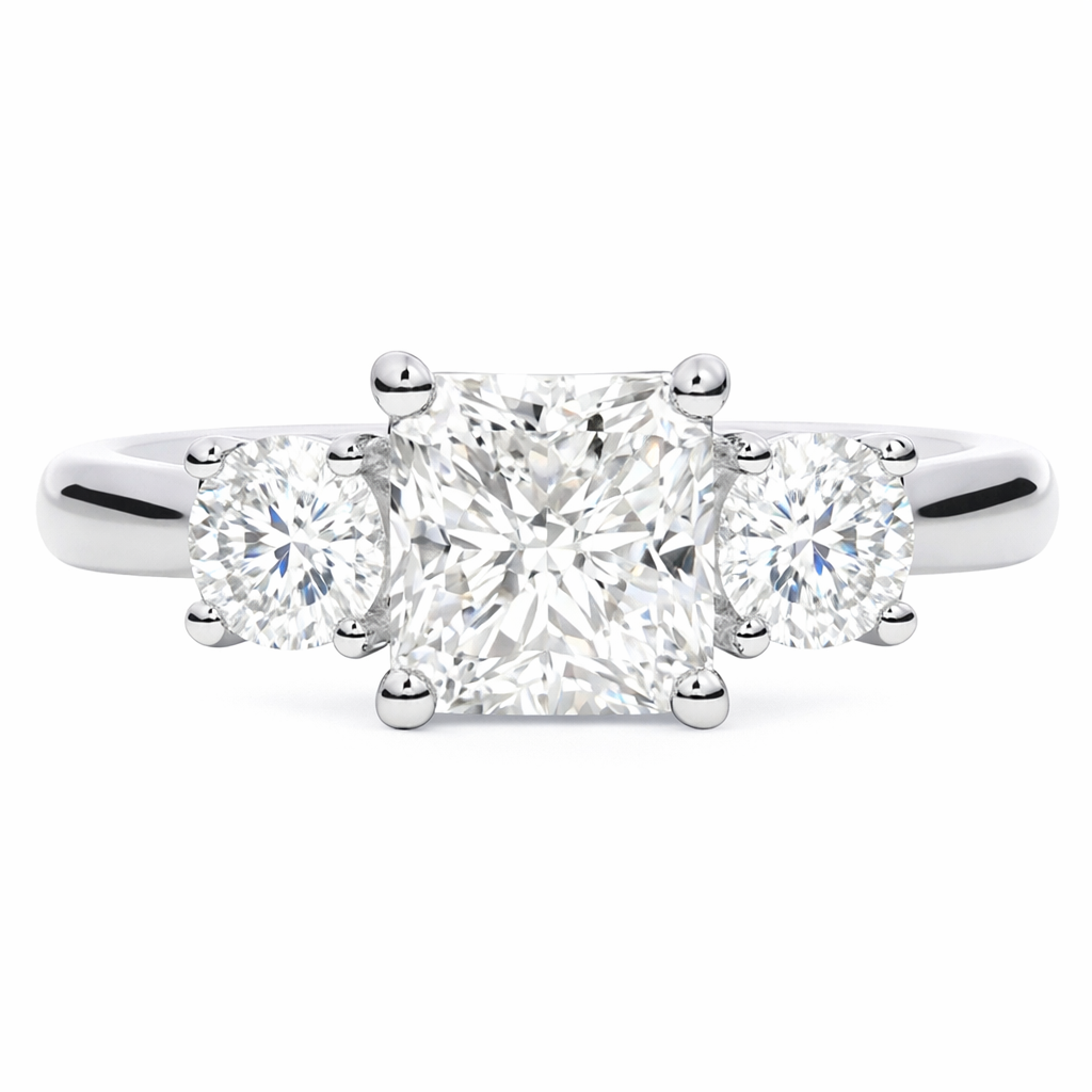 A brand-new, unused IGI-certified natural diamond three-stone cluster ring crafted in platinum and designed to combine presence, balance, and long-term value. At the centre sits a radiant-cut natural diamond weighing 1.21 carats, graded H colour and SI2 clarity, selected for its lively faceting and strong visual spread. Flanking the centre stone are two brilliant-cut natural diamonds, each weighing 0.19 carats, arranged to enhance symmetry and light performance while drawing attention back to the radiant centre. The platinum setting provides strength, security, and a refined finish that complements the diamonds without distraction.
