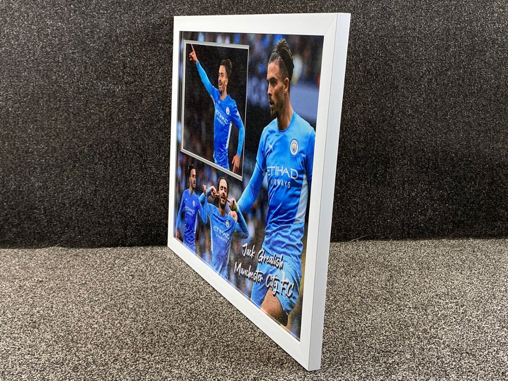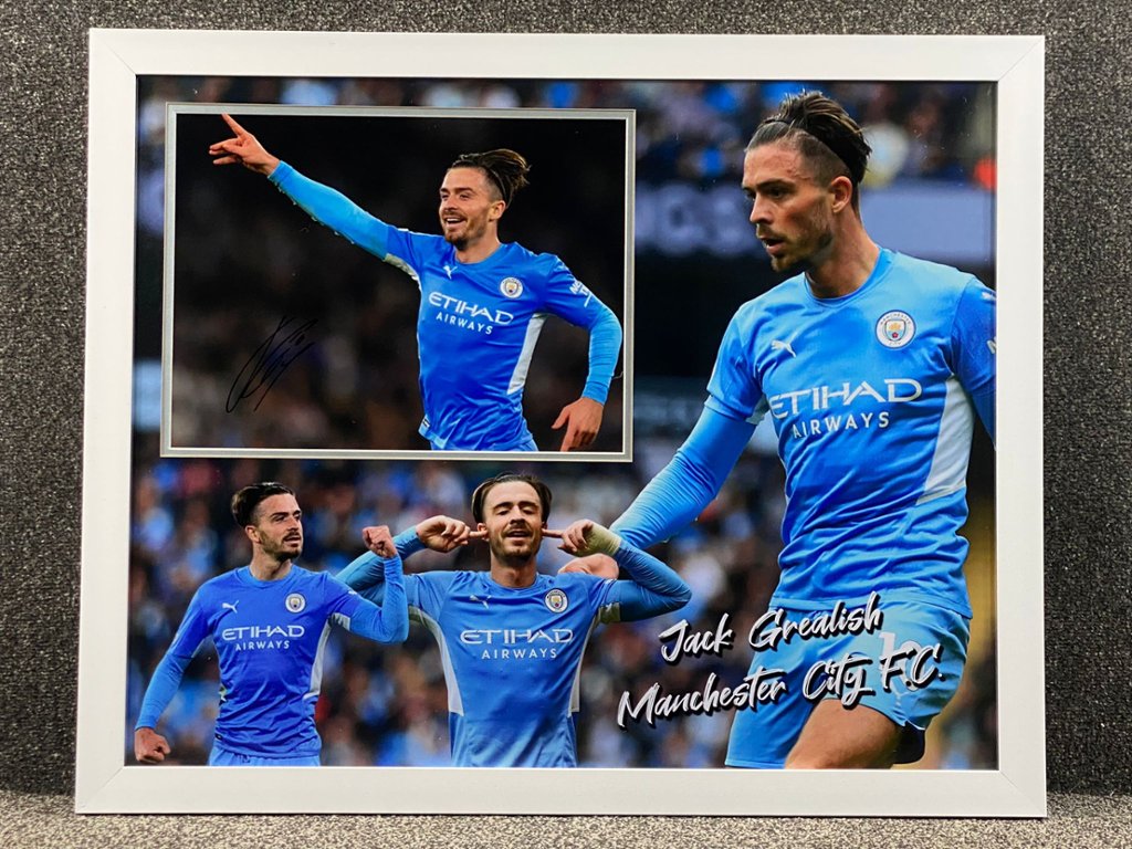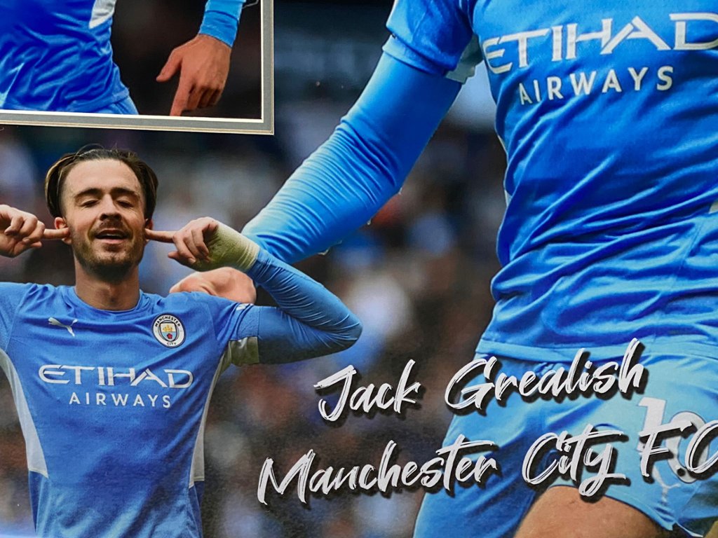 A signed and authenticated Jack Grealish Man City Picture in a presentation frame. Approx 27" height, 33" width.
