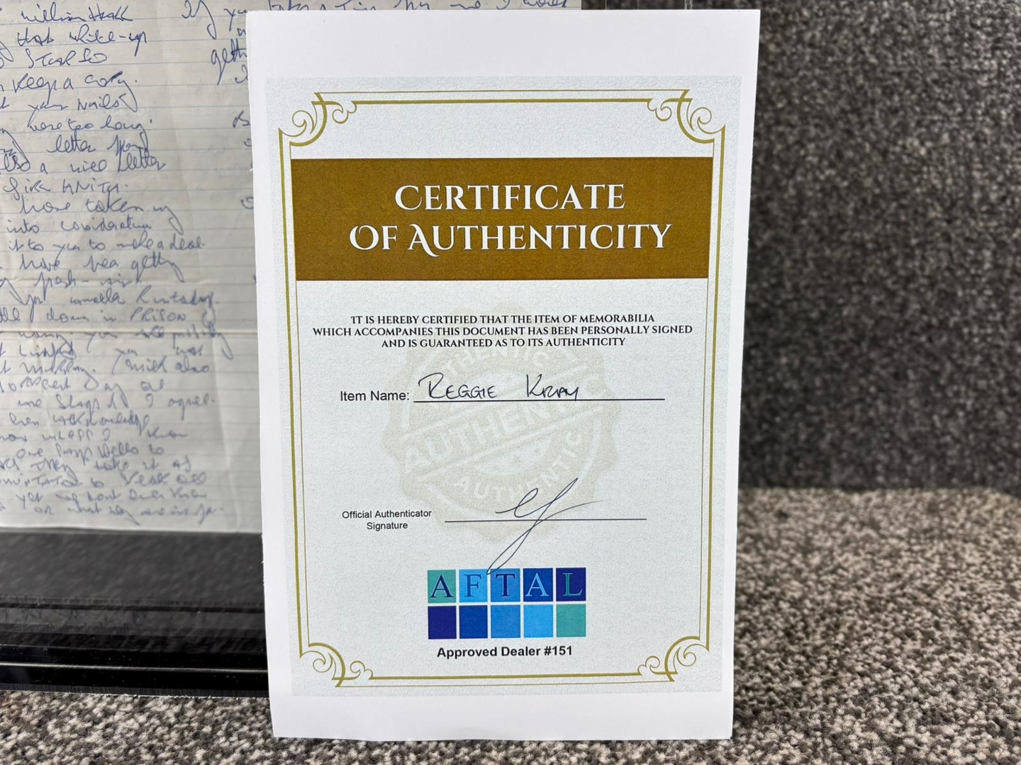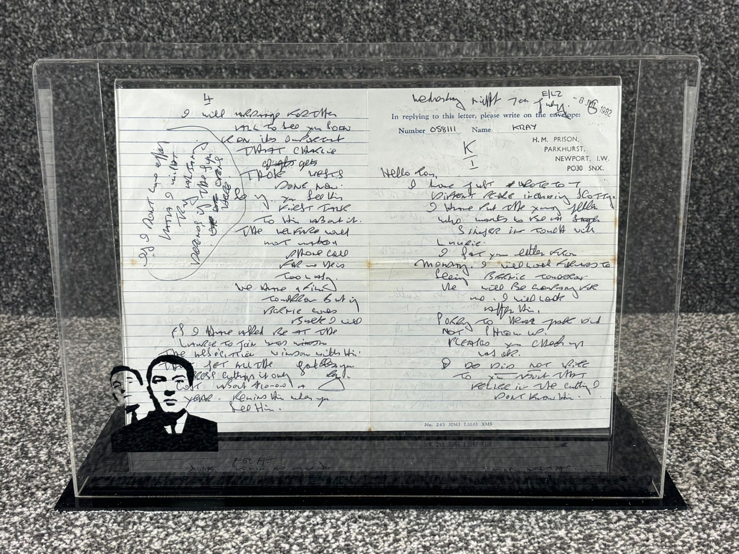 A signed and authenticated letter from Reggie Kray to his brother Ronnie from Prison in a presentation case. Approx 28cm height, 38cm width.