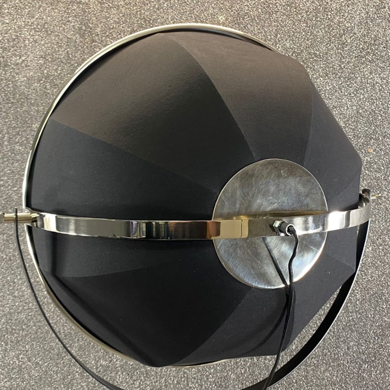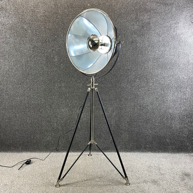 The lamp features a large reflective nickel-finish shade mounted on sleek black tripod legs, blending vintage character with modern sophistication. Its adjustable head allows you to direct light where it’s needed, making it both a striking feature piece and a practical lighting solution.