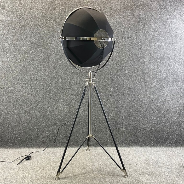 A black and nickel tripod floor cannon lamp makes a bold statement with its industrial-inspired design and commanding presence. Standing approximately 53 inches high, 22 inches wide, and 12 inches deep, it captures the look of a classic studio spotlight, bringing a touch of cinematic flair to your interior.