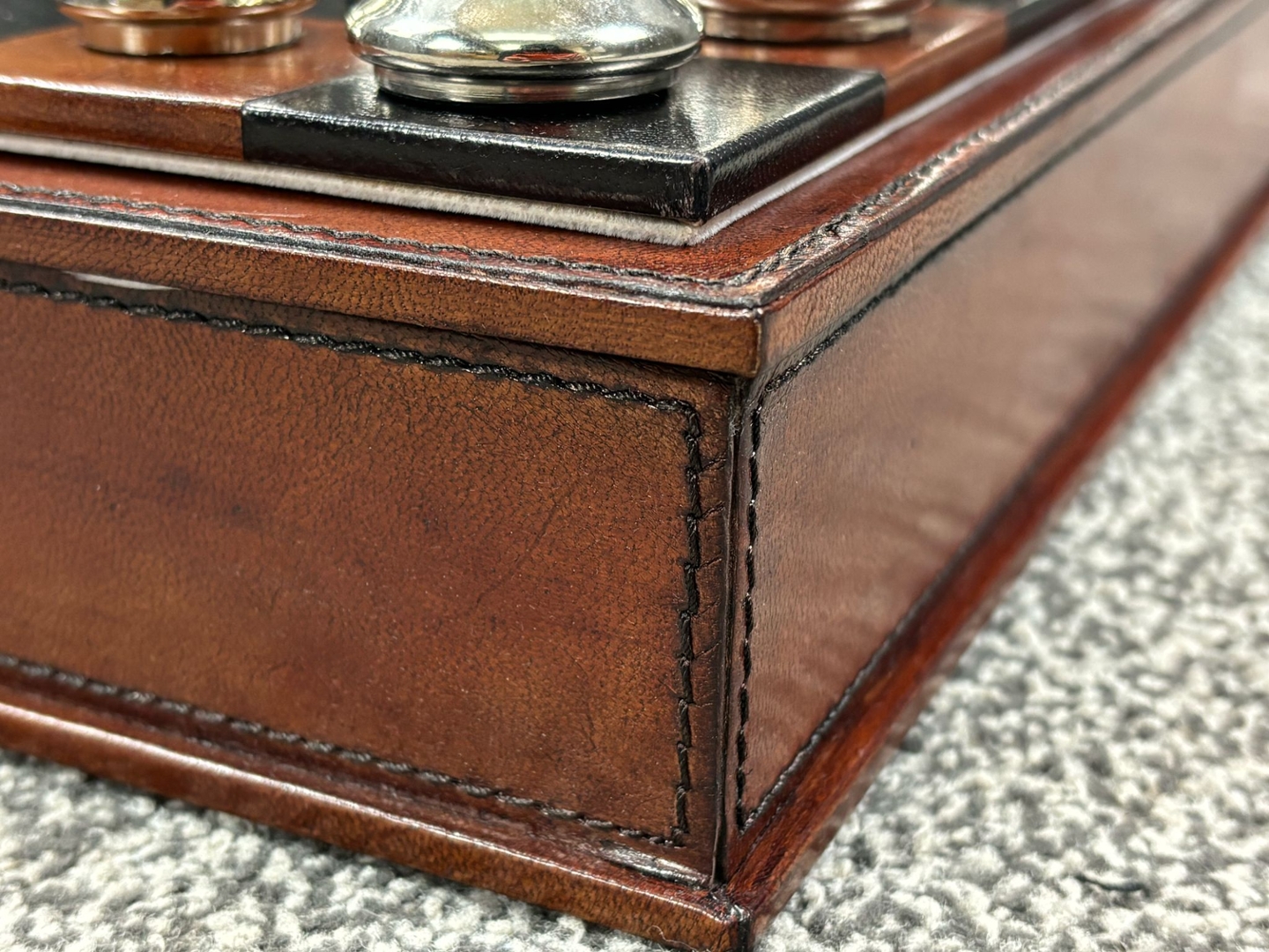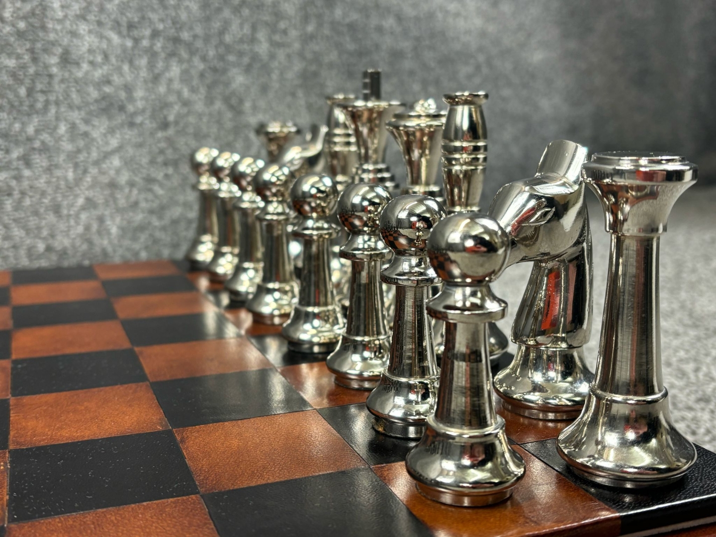 A hand-built chess set is a true testament to craftsmanship, combining luxury and functionality in an elegant design. Crafted from fine Italian leather, the board features a stunning two-tone stitched pattern that exudes sophistication. The warm, rich brown tones contrast beautifully with the black squares, creating a refined playing surface that enhances the overall aesthetic.