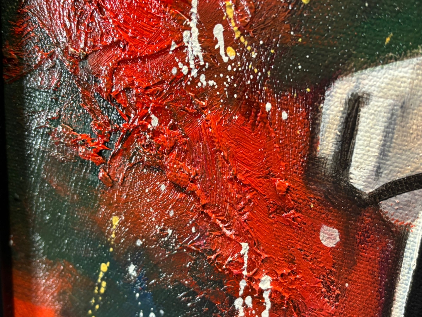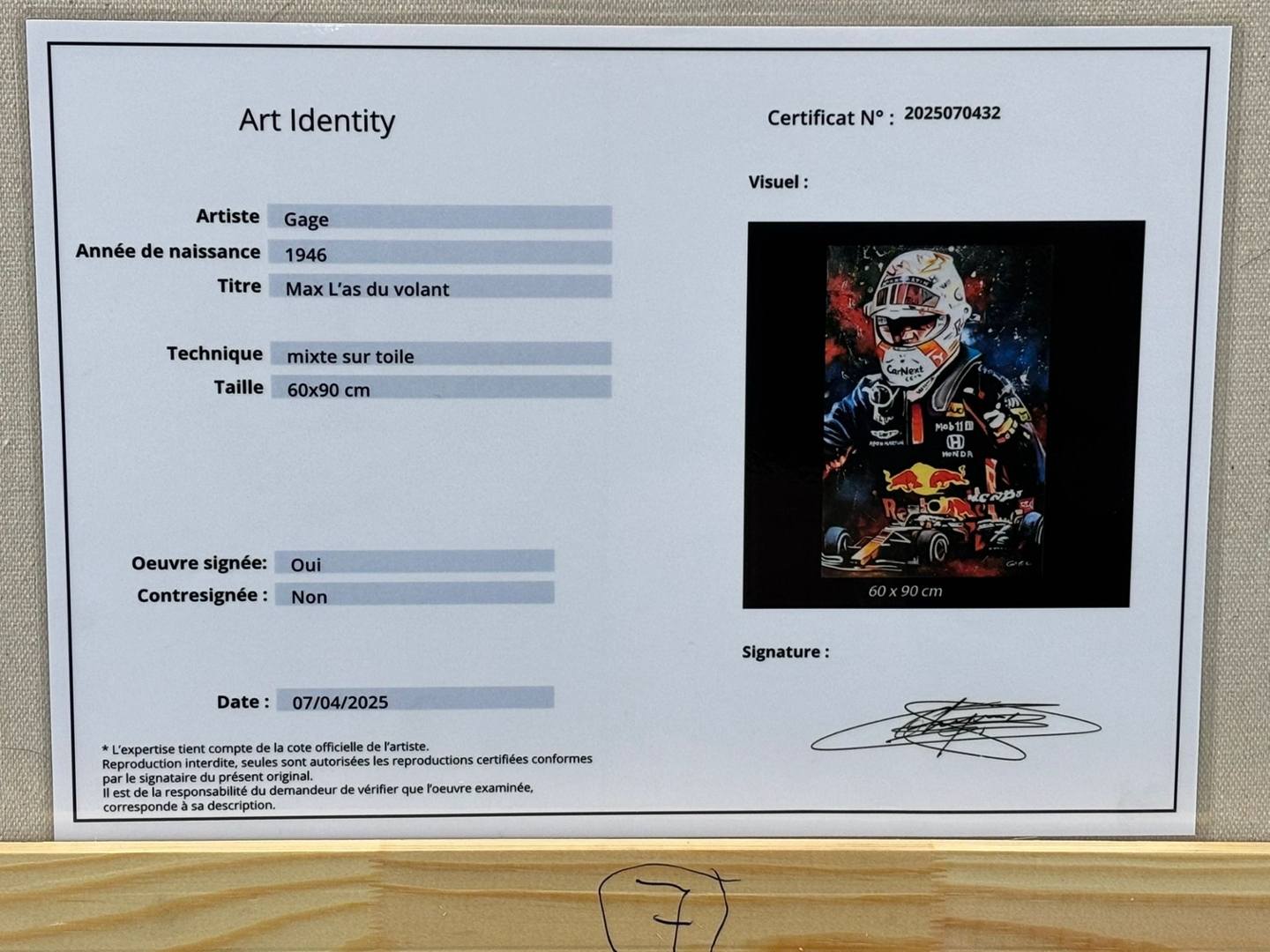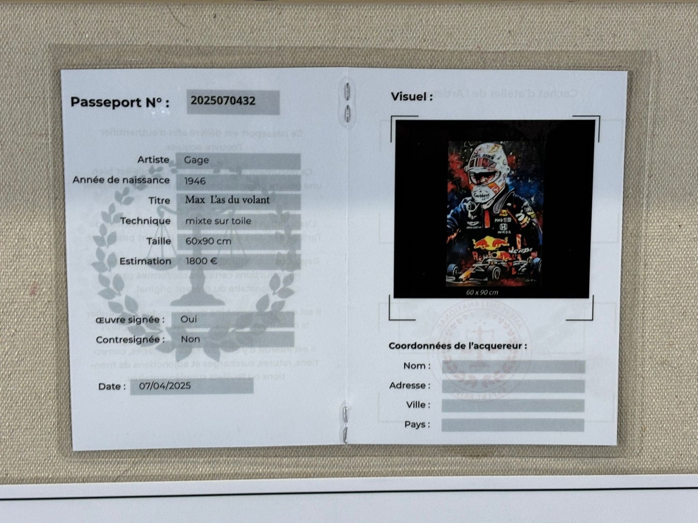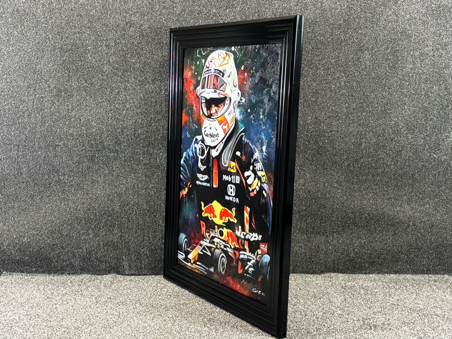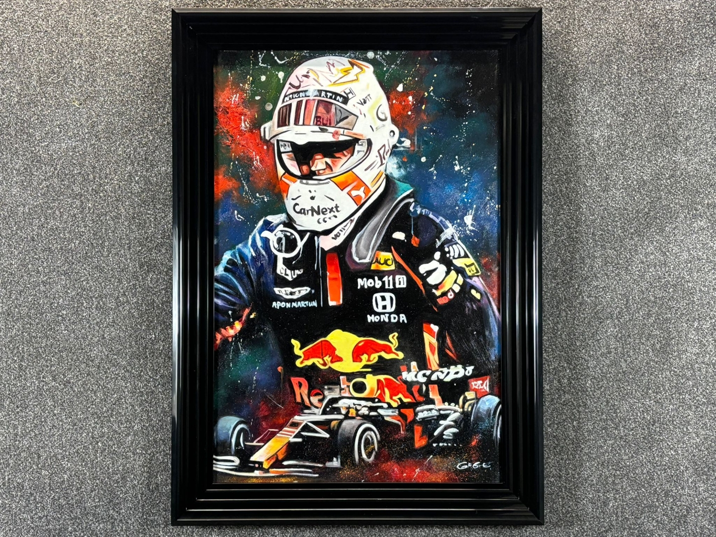 An original oil painting by the artist Gage, titled Max L’as du Volant, is a thrilling tribute to Formula 1 champion Max Verstappen. Measuring 90cm x 60cm, the artwork bursts with energy and precision, capturing the Dutch driver in the heat of competition. Gage’s dynamic brushwork and bold use of colour bring the Red Bull Racing icon to life, conveying both the intensity and speed that define his career.