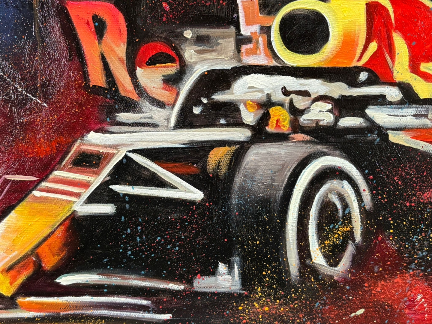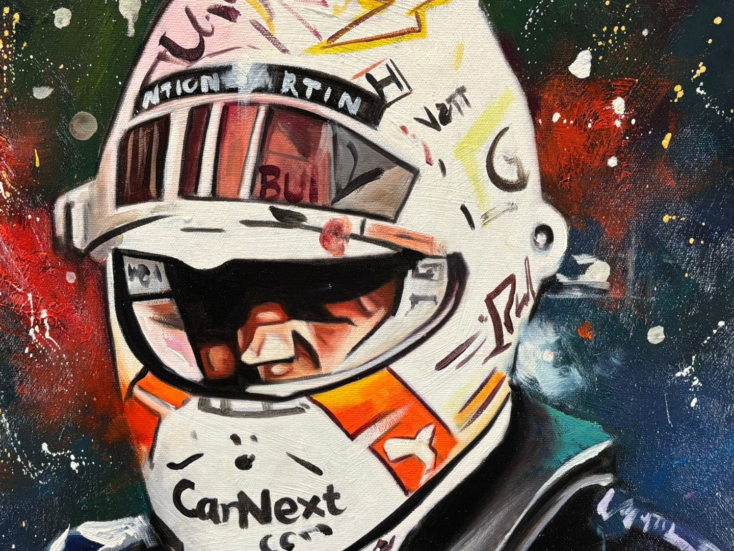 The composition perfectly balances realism and abstraction — the detailed rendering of the helmet and racing suit contrasts with the explosive background of reds, blues, and yellows, symbolising the adrenaline and chaos of the race. The iconic Red Bull branding and Verstappen’s focused stance make this piece instantly recognisable and full of impact.