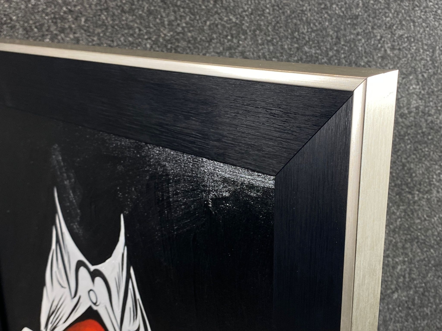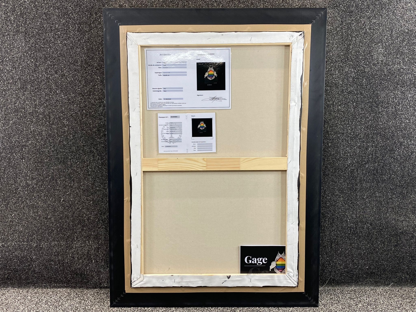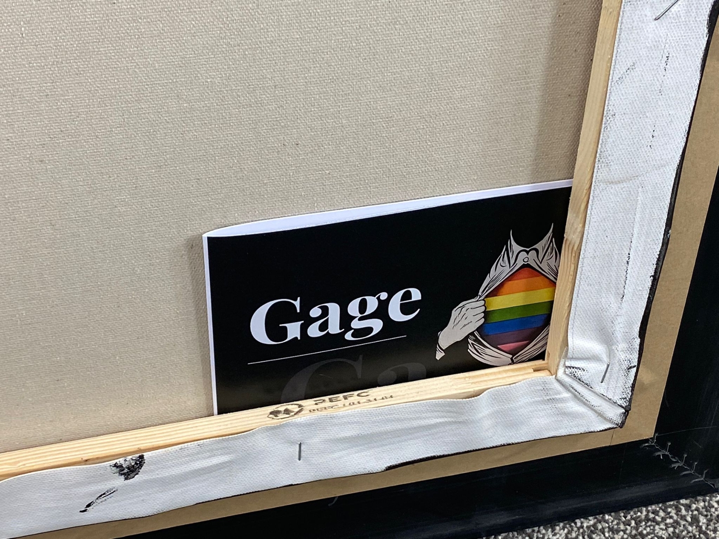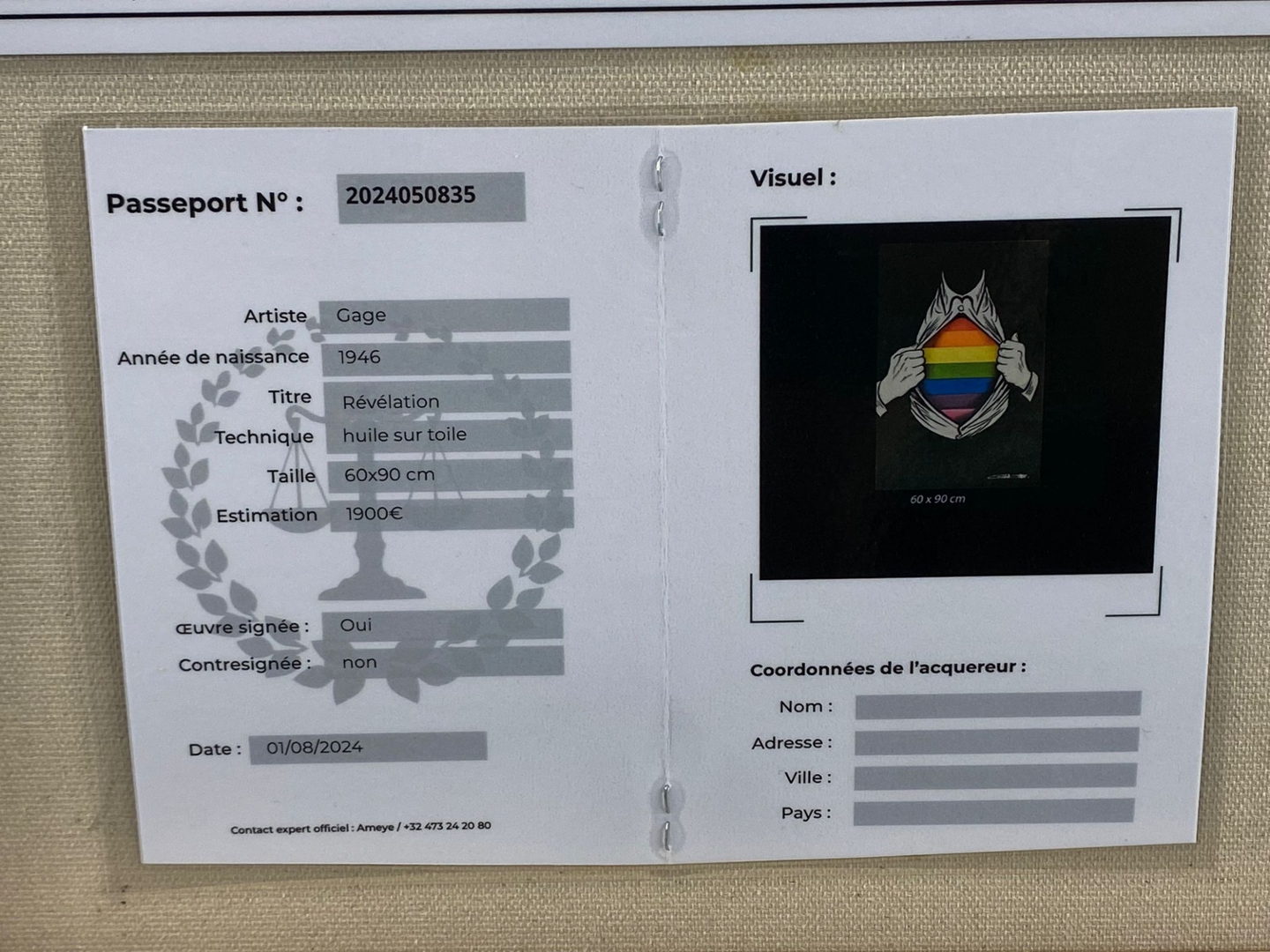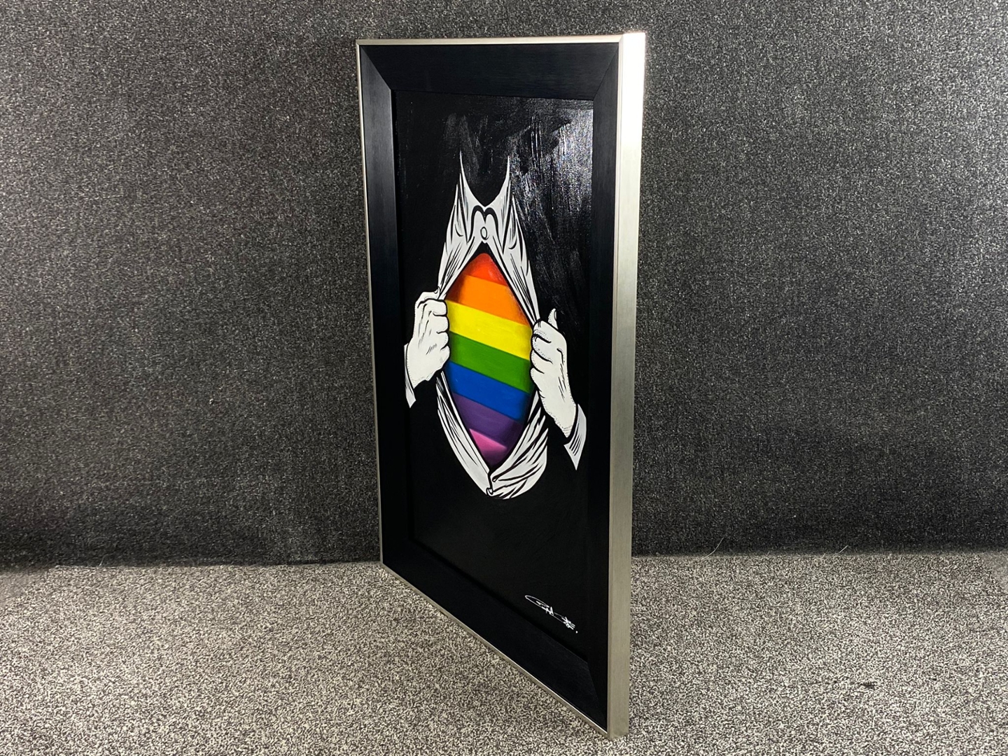 The painting is framed in an elegant combination of black and silver, which enhances its modern sophistication and draws attention to the vibrant colours of the flag. The black frame provides a dramatic contrast, while the silver accents add a touch of refinement, making the artwork stand out as both contemporary and impactful. Valued at €1900, "Revelation" is not only a celebration of diversity and pride but also a visually compelling piece that invites viewers to reflect on the significance of embracing one's true self.