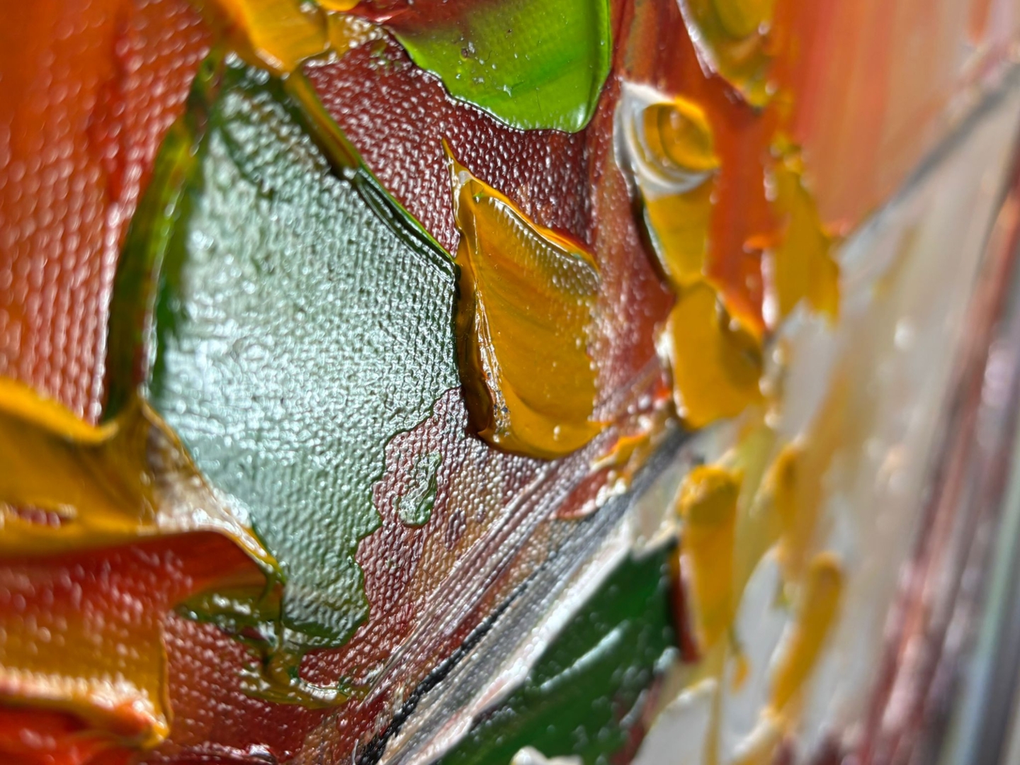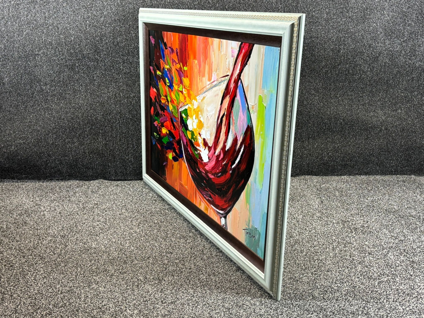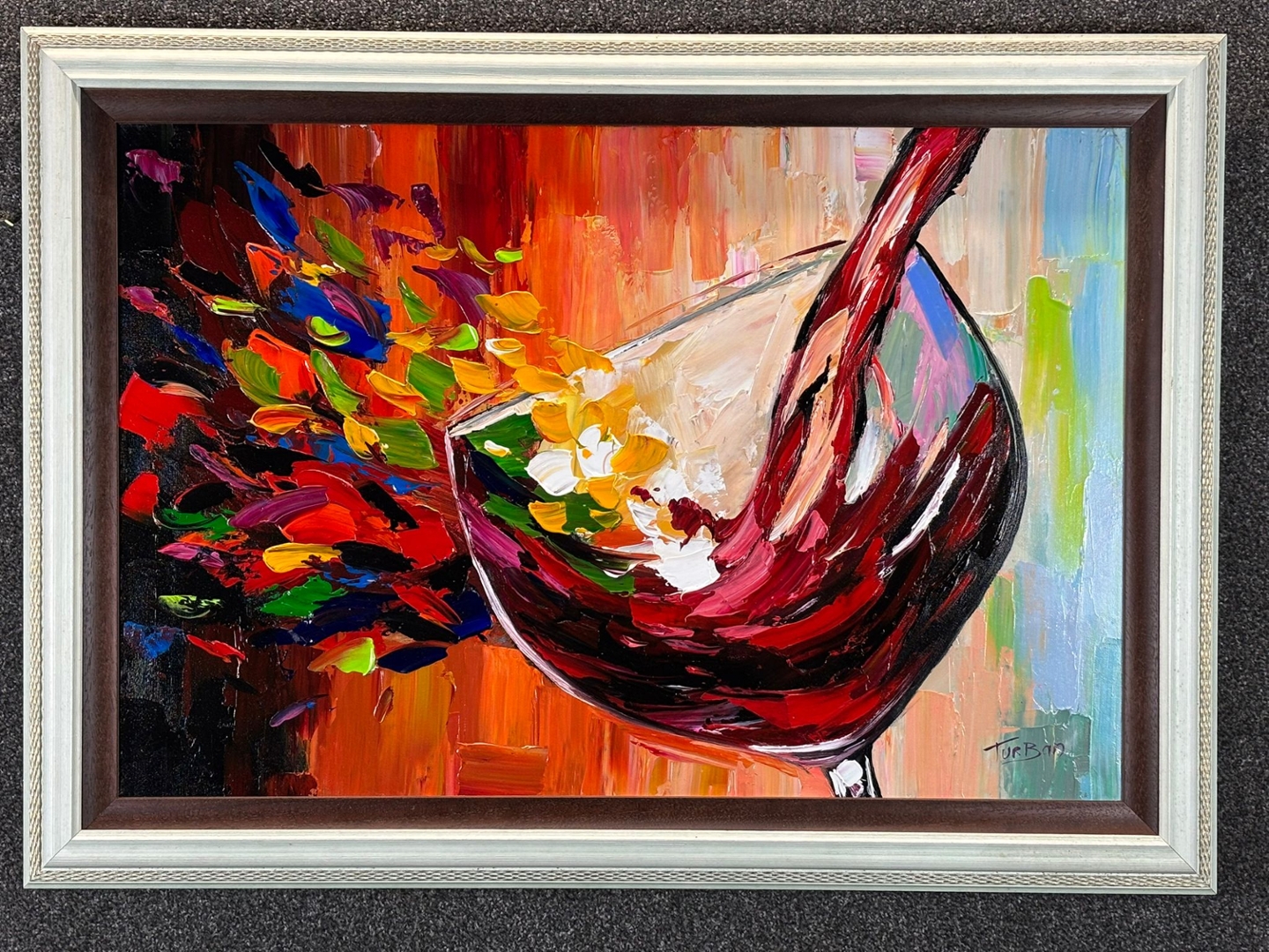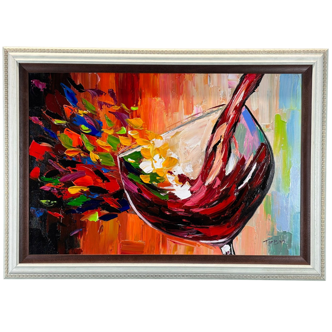 An original oil painting by the artist Turban, titled L’âme du Vin, beautifully captures the passion and movement of a glass of red wine in motion. Measuring 60cm x 90cm, the artwork bursts with life and colour, as deep crimson tones swirl gracefully within the glass, surrounded by bold splashes of orange, yellow, blue, and green. The result is a captivating fusion of energy and elegance that evokes both celebration and artistry.