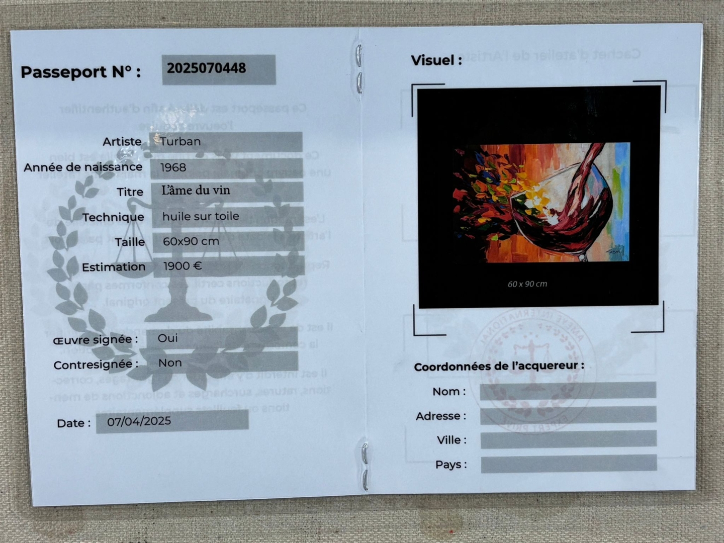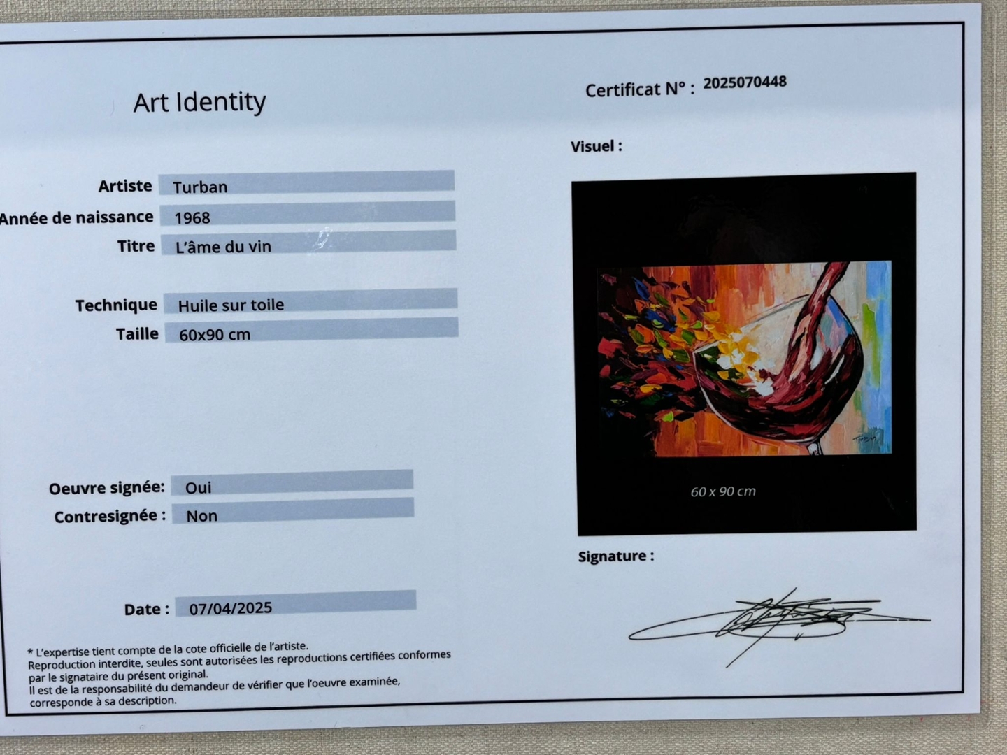 Presented in a refined white frame and valued at €1900, L’âme du Vin is a striking statement piece that celebrates the joy and soul of life’s finest pleasures.