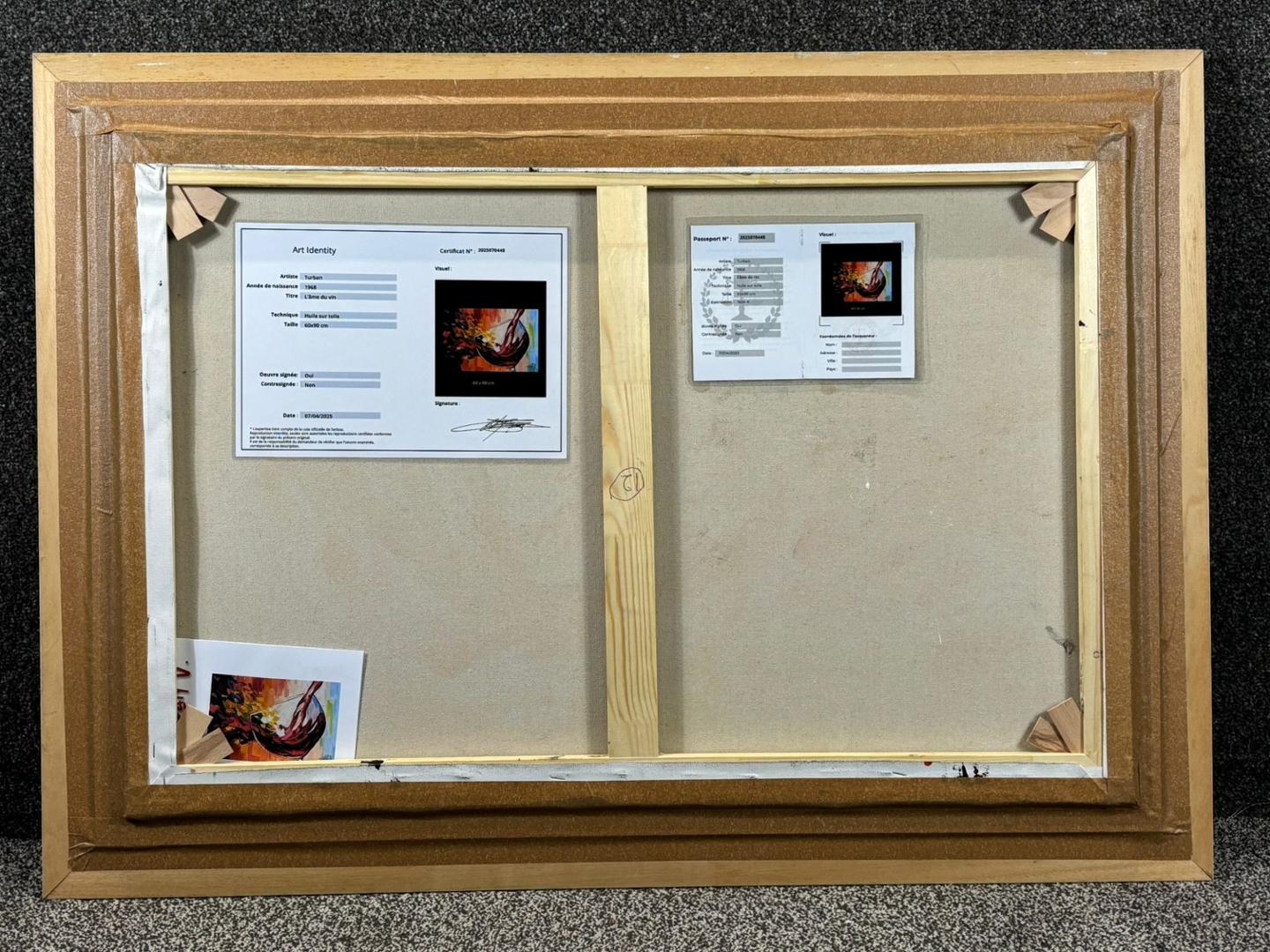 A white framed original oil painting by the artist Turban titled L'ame du Vin.