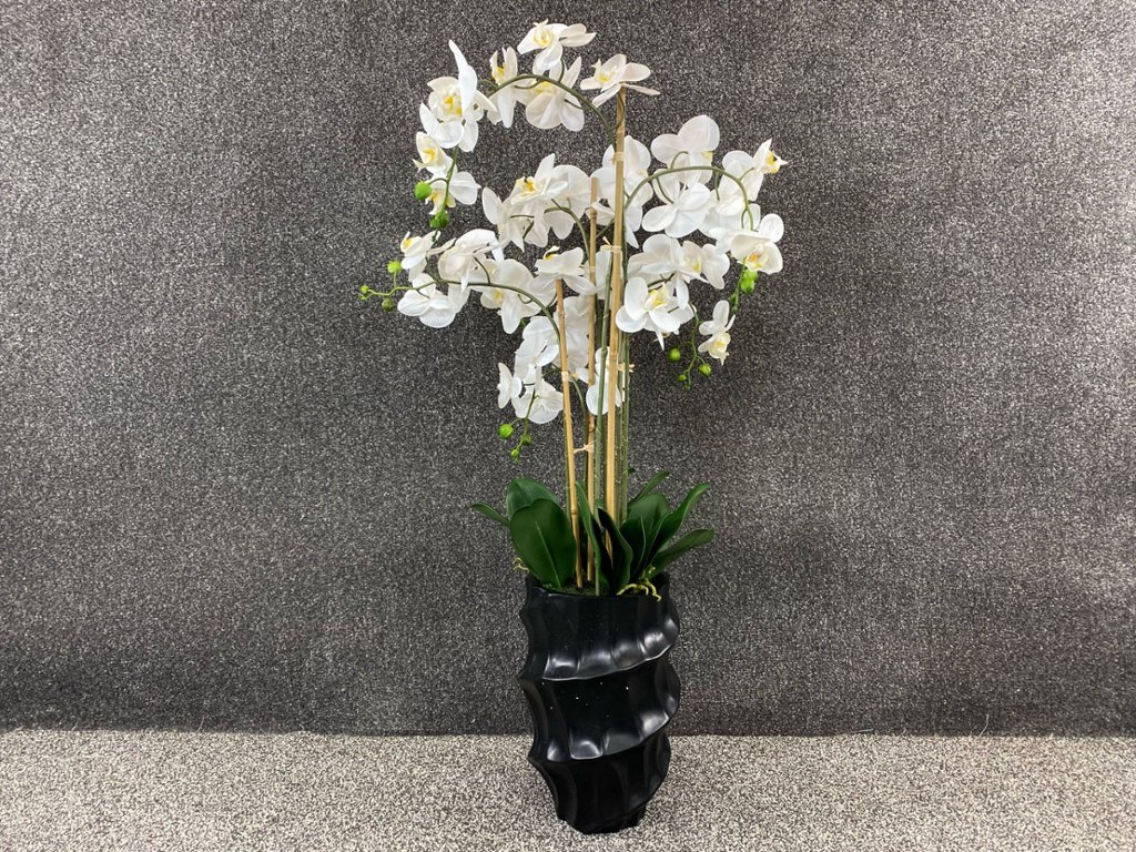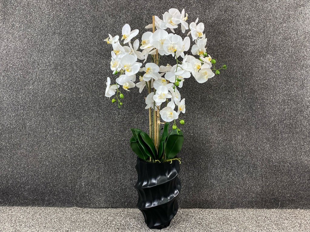 A Large Artificial White Tall Orchid, elegantly showcased in a Black Swirl Design Pot, is the epitome of sophistication and grace for your interior decor. Standing tall at approximately 41 inches in height, with a width of 21 inches and a depth of 10 inches, this majestic orchid arrangement commands attention and admiration.