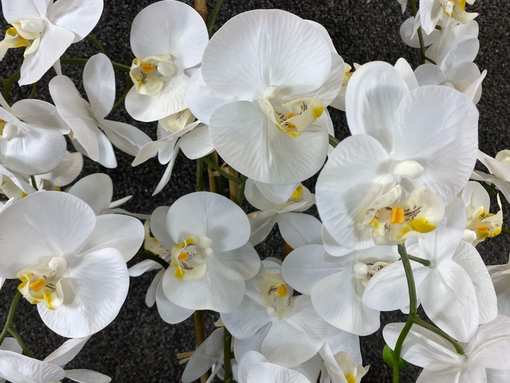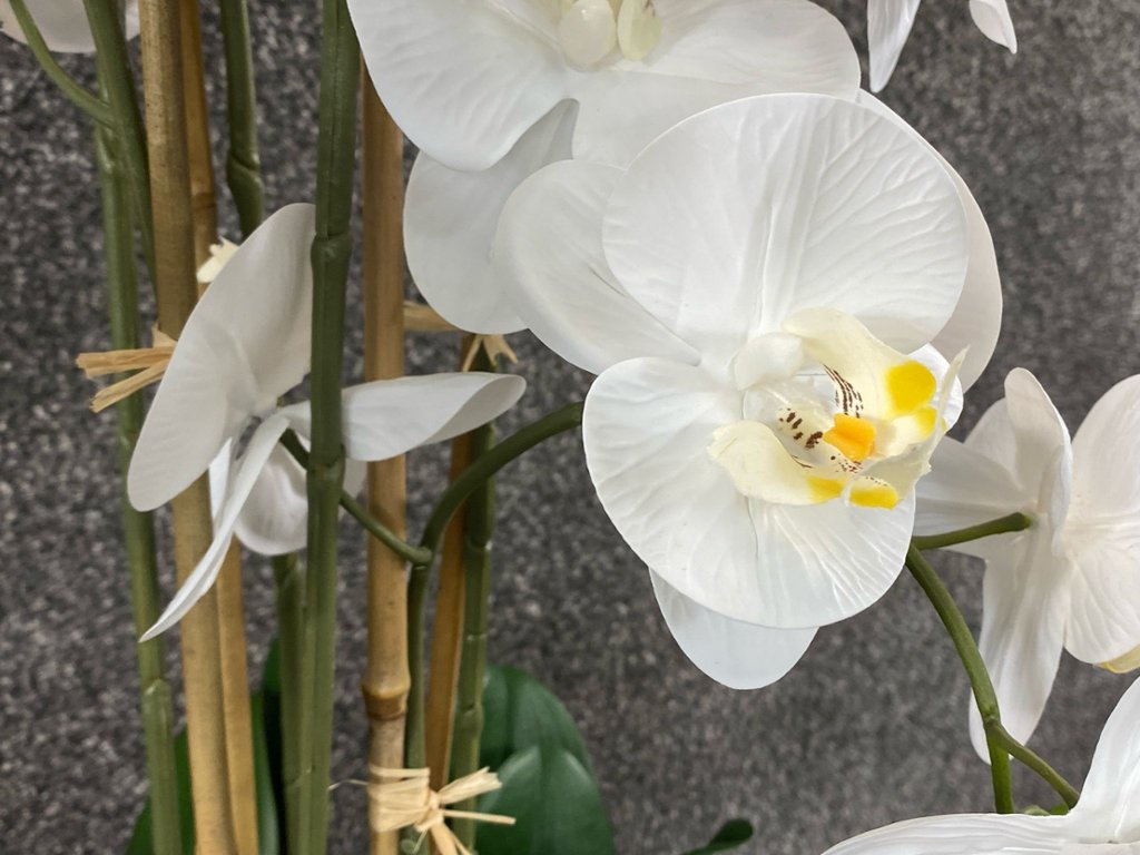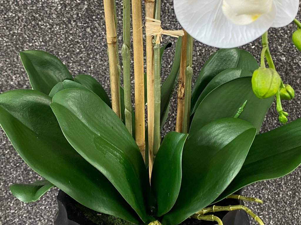 The orchid boasts a stunning array of pristine white blooms meticulously crafted to mirror the delicate allure of real orchids. Each flower is intricately detailed to capture the natural curves and intricate textures, ensuring a lifelike appearance that infuses any space with timeless beauty.