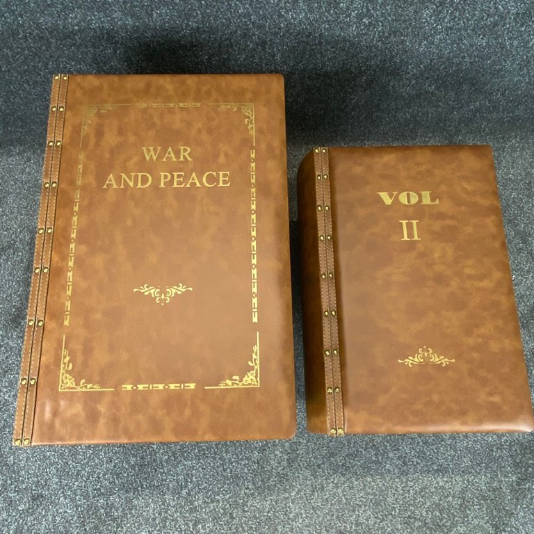 The set includes one large trunk and one medium trunk, each designed to resemble a classic book from the pages of "War & Peace." The large trunk measures approximately 18 inches in height, 24 inches in width, and 16 inches in depth, providing ample storage space for blankets, linens, or other household items.