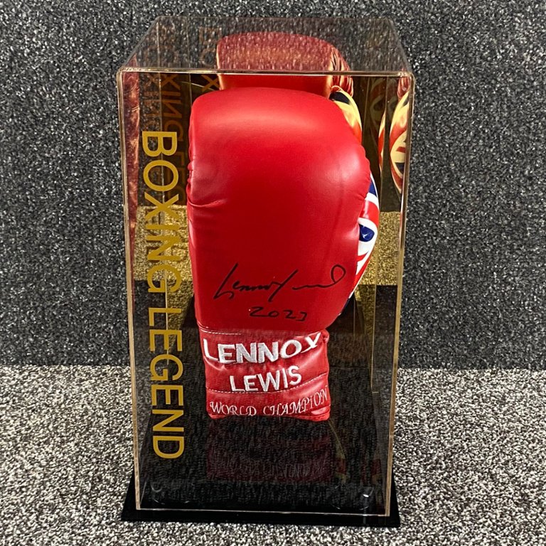 A signed & authenticated Lennox Lewis Red Union Jack Boxing Glove in a presentation case. Approx 15" height, 9" width.