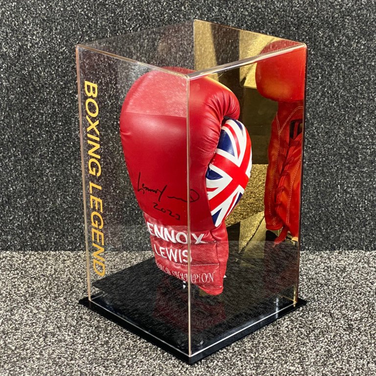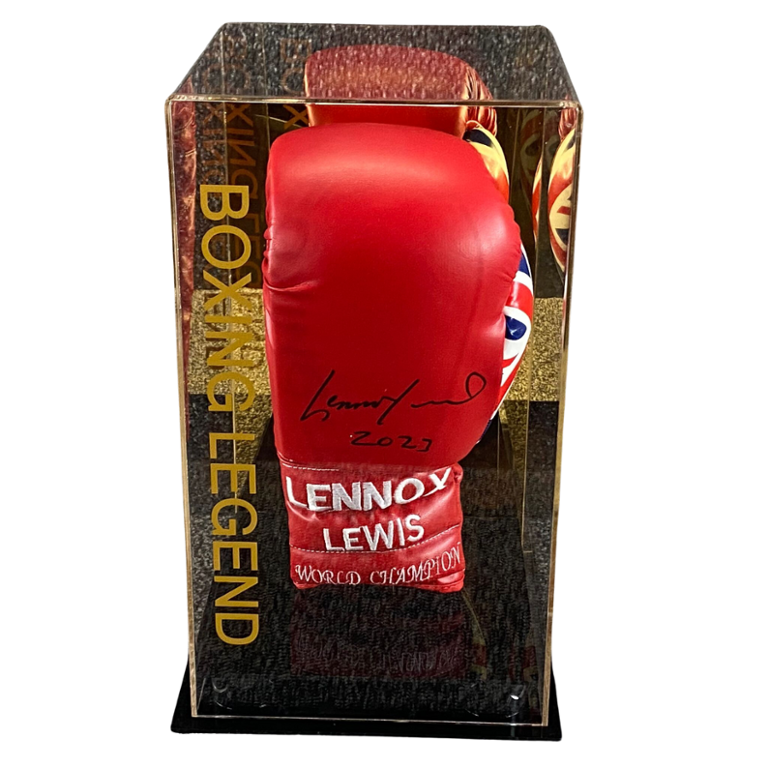 Encased in a protective presentation case, this boxing glove features the iconic Union Jack design, symbolizing Lewis's proud British heritage and his significant impact on the sport of boxing. The glove's signature, Lennox Lewis's, adorns it, providing undeniable evidence of its connection to the esteemed boxer.