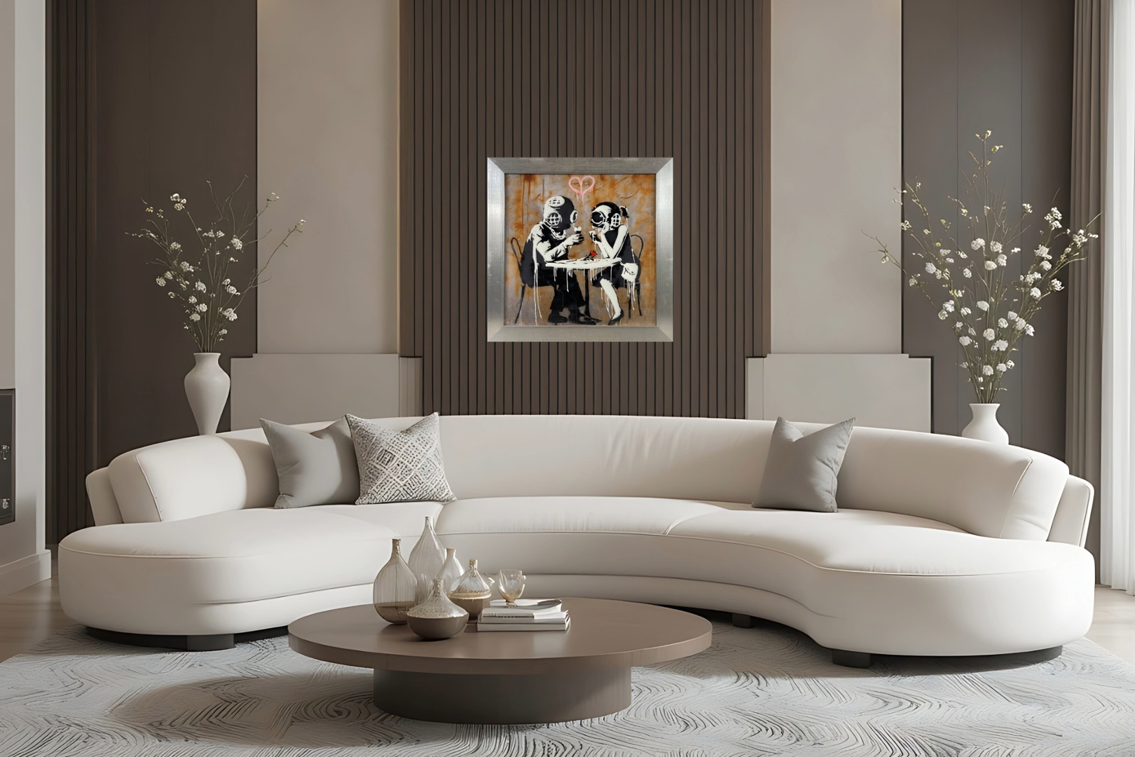 Within its silver frame, "Diver Lovers" transcends traditional boundaries of art, offering a poignant exploration of human emotion and the enduring quest for meaningful connections. Banksy's artwork continues to provoke dialogue on the intricacies of love and intimacy, urging us to reconsider our perceptions and embrace the universal aspects of human relationships.