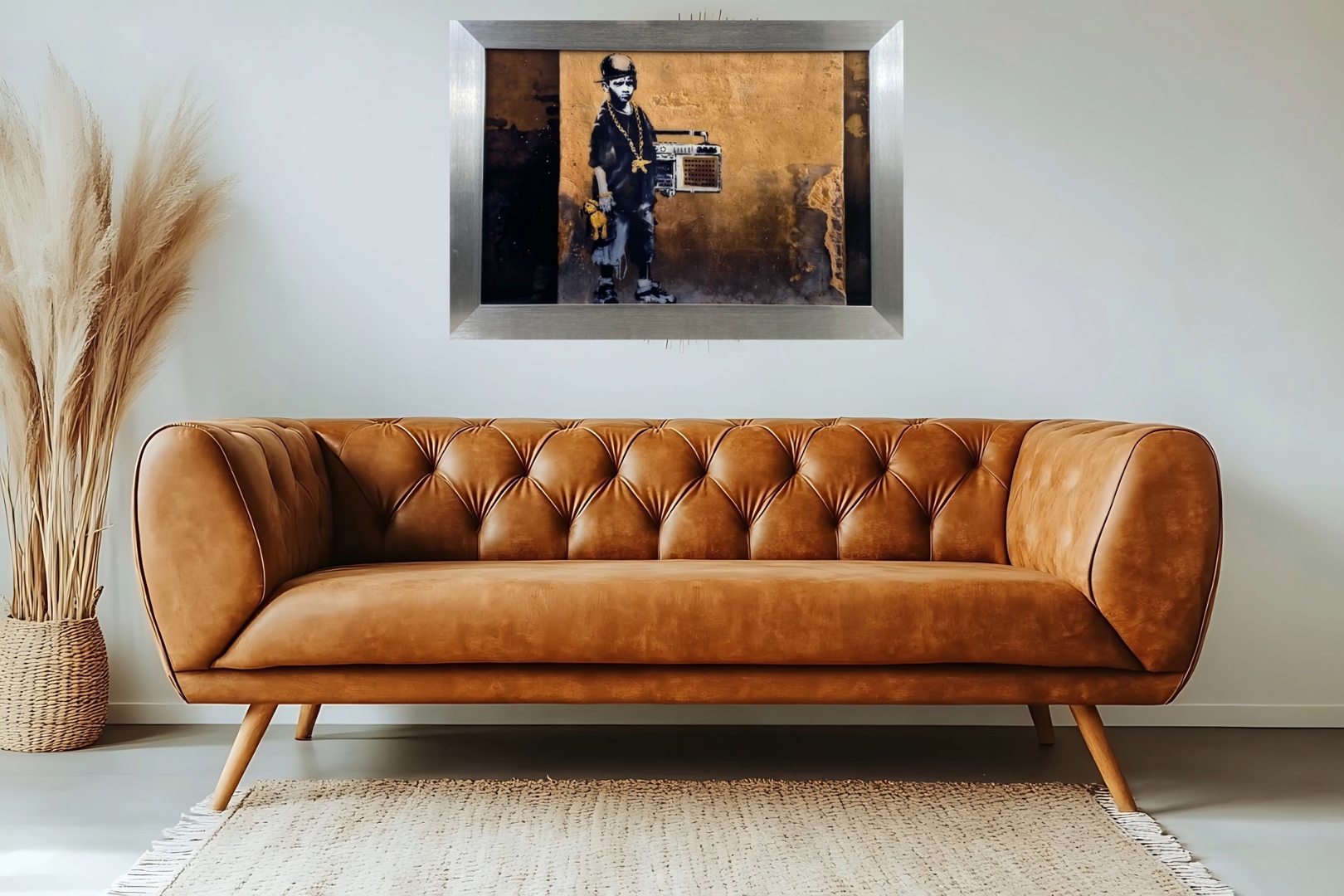 At the centre of "Gangster Boy" stands a young boy, depicted in Banksy's signature stencil technique, with a bold and defiant stance. The boy wearing a chain and stereo under his arm —an iconic pose associated with street culture and defiance against authority. The stark contrast between the boy's anonymity and the intensity of his presence draws immediate attention, compelling viewers to contemplate the challenges and aspirations of youth in contemporary urban settings.