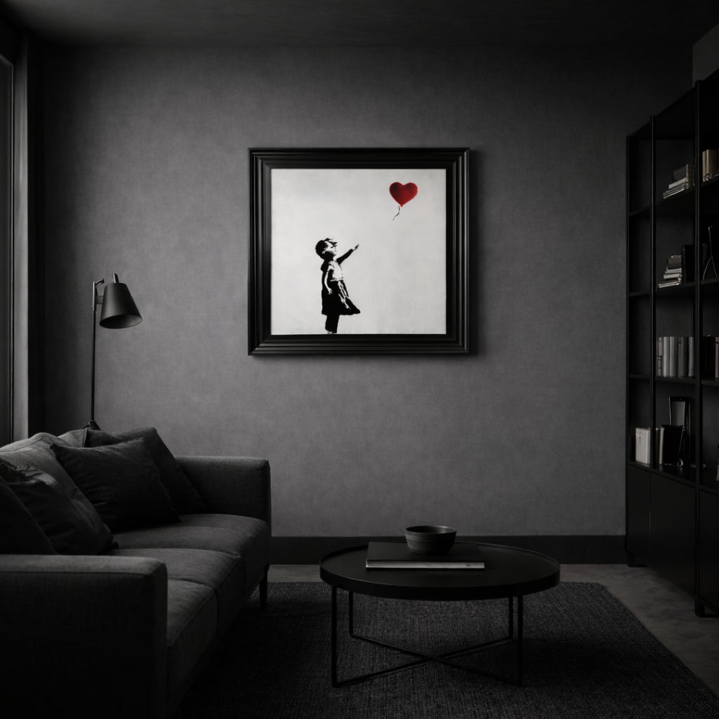 A brand new black framed liquid art picture by Banksy, titled Girl with Heart Balloon. Measuring 86cm in height and 86cm in width, this poignant artwork features one of the most iconic images in modern street art—a young girl reaching out as a bright red, heart-shaped balloon floats just out of reach. Rendered in stark black and white with the striking contrast of the vivid red balloon, the piece radiates emotional depth and quiet storytelling.