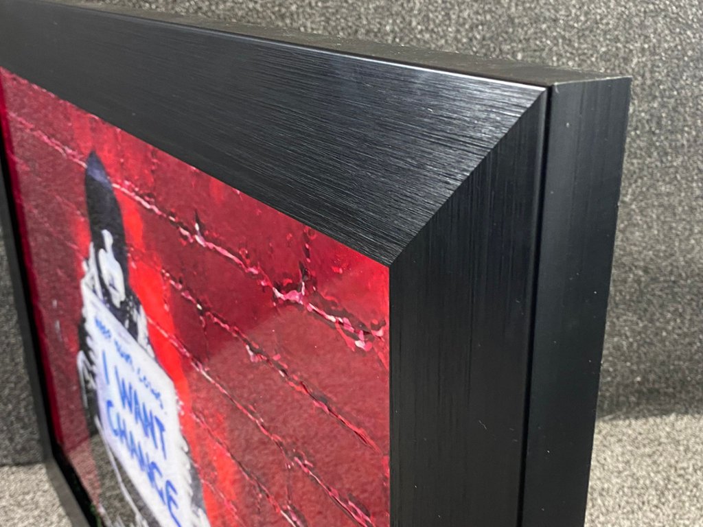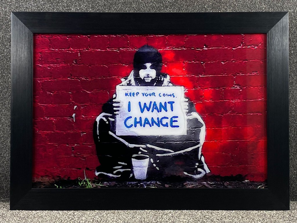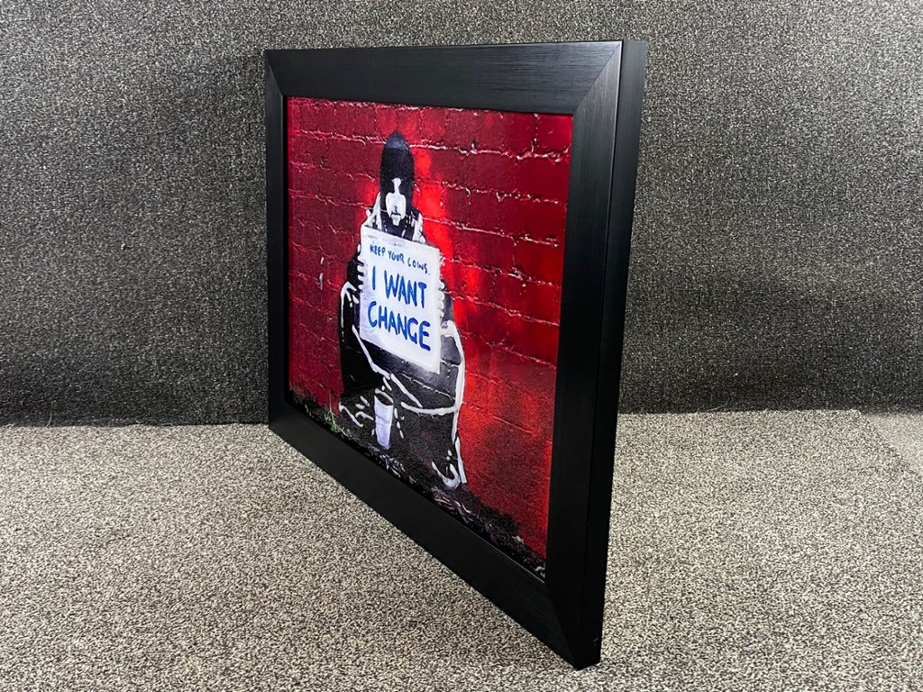 A brand new black framed liquid art picture by Banksy titled Keep Your Coins, I Want Change.
