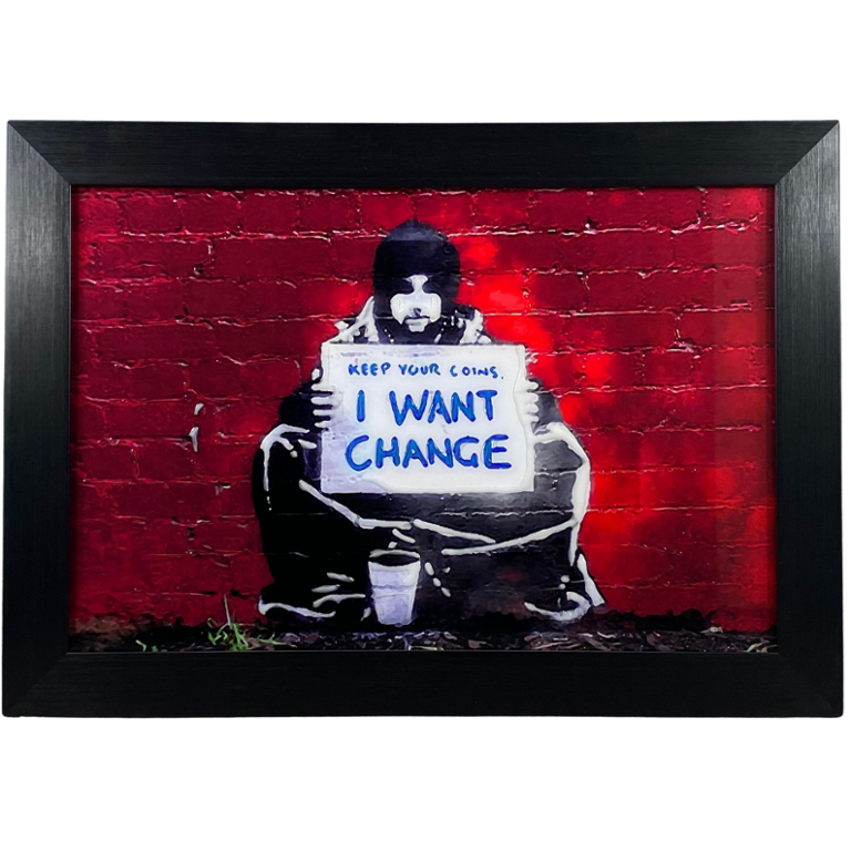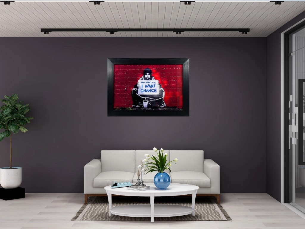 The black framed liquid art picture titled "Keep Your Coins, I Want Change" by Banksy is a poignant reflection on societal inequities, measuring 30 inches in height and 38 inches in width. At its heart is a thought-provoking image: a lone figure, depicted with Banksy's characteristic blend of realism and symbolic depth, holding a weathered sign that reads "Keep Your Coins, I Want Change."