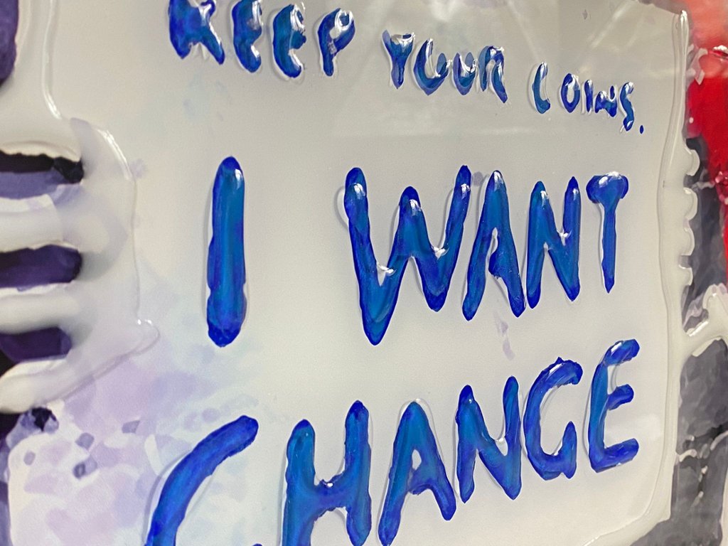 The figure's presence is a stark contrast against the backdrop of dynamic colours created through the liquid art technique. Shades of black and red interplay to evoke a sense of urgency and movement, enhancing the emotional impact of the scene. The sign in the figure's hands serves as a powerful symbol, challenging the viewer to confront issues of wealth disparity, social justice, and the pursuit of meaningful societal transformation.
