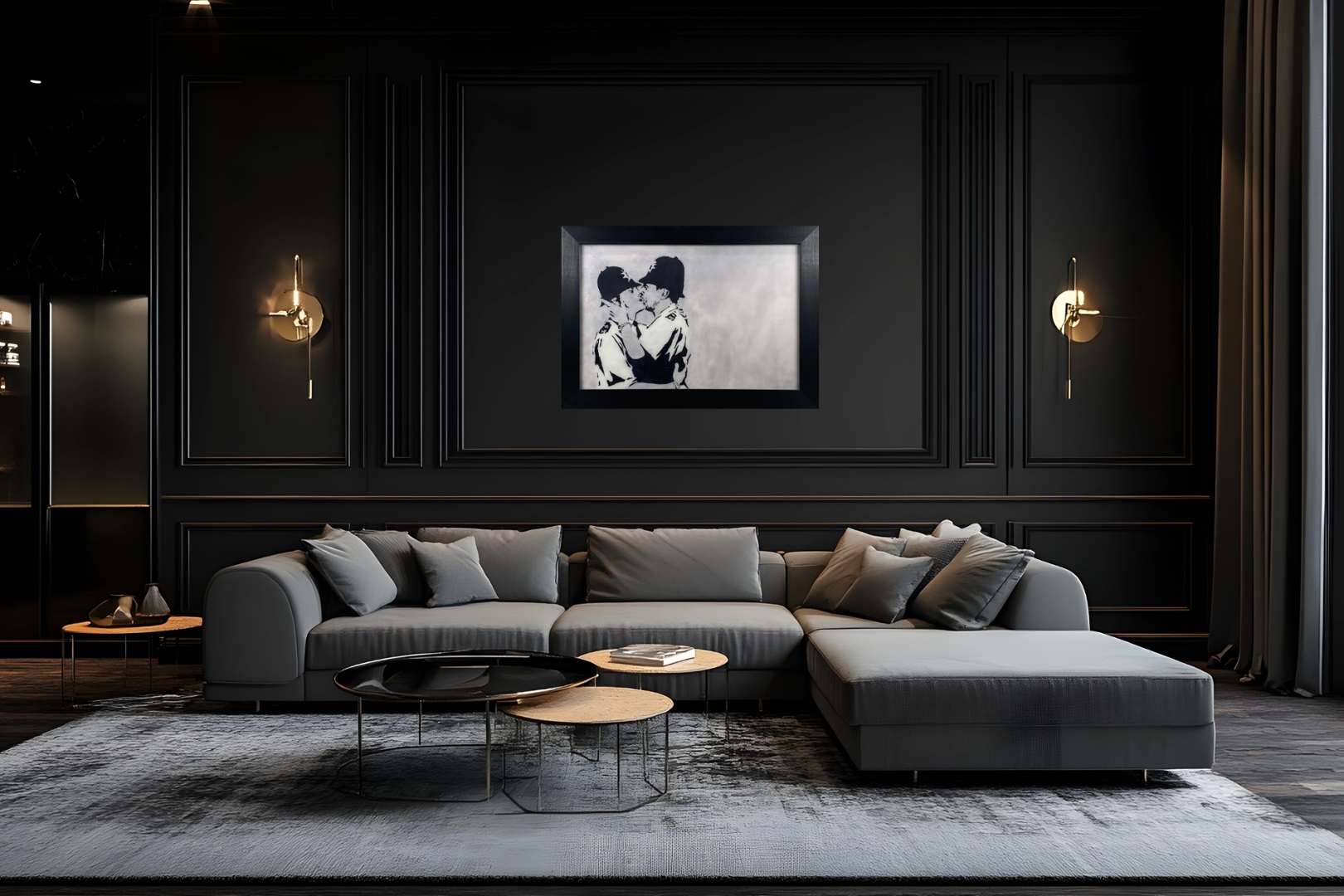 At the heart of "Kissing Coppers" is a powerful image rendered in Banksy's signature stencil style. The artwork portrays two uniformed police officers locked in a passionate kiss, challenging traditional perceptions of authority and masculinity. The officers' embrace is captured against a plain backdrop, emphasizing the intimacy of the moment and inviting viewers to contemplate themes of love, identity, and societal norms.