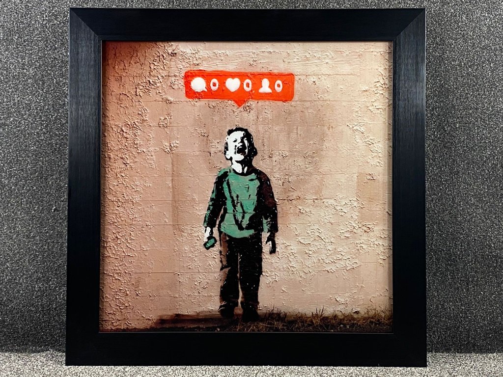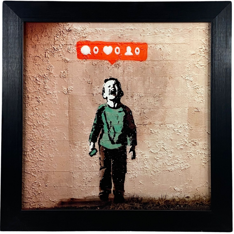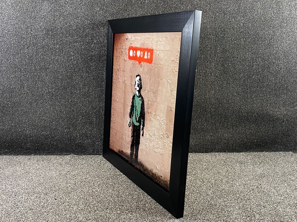 Within its black frame, "Nobody Likes Me" transcends traditional interpretations of art; it becomes a poignant critique of contemporary culture and the pervasive influence of social media on the individual psyche. Banksy's work continues to provoke thought and inspire dialogue, urging us to reassess our values and priorities in pursuit of meaningful connections and authentic self-expression.
