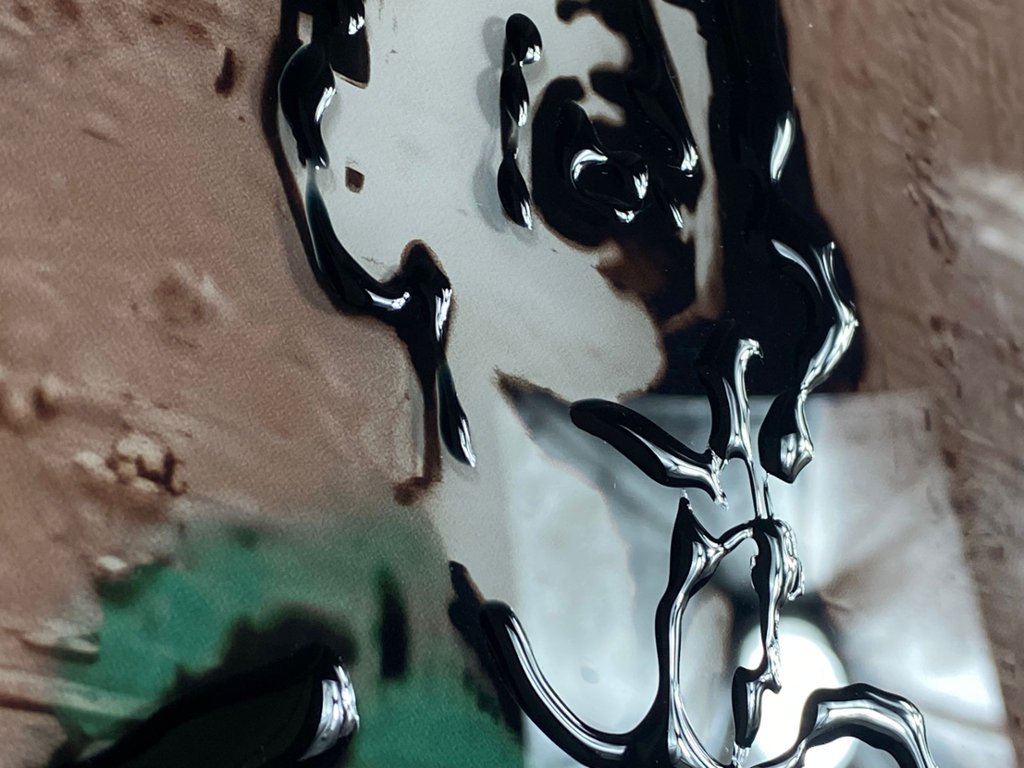 The liquid art technique enriches the emotional depth of the piece, with colours that flow and merge to evoke a sense of vulnerability and contemplation. The subdued tones and subtle textures enhance the sombre mood, underscoring the impact of societal pressures and digital expectations on individual identity and self-esteem. The black frame provides a bold contrast, framing the composition with a sense of urgency and drawing viewers' attention to the stark commentary on modern social dynamics.