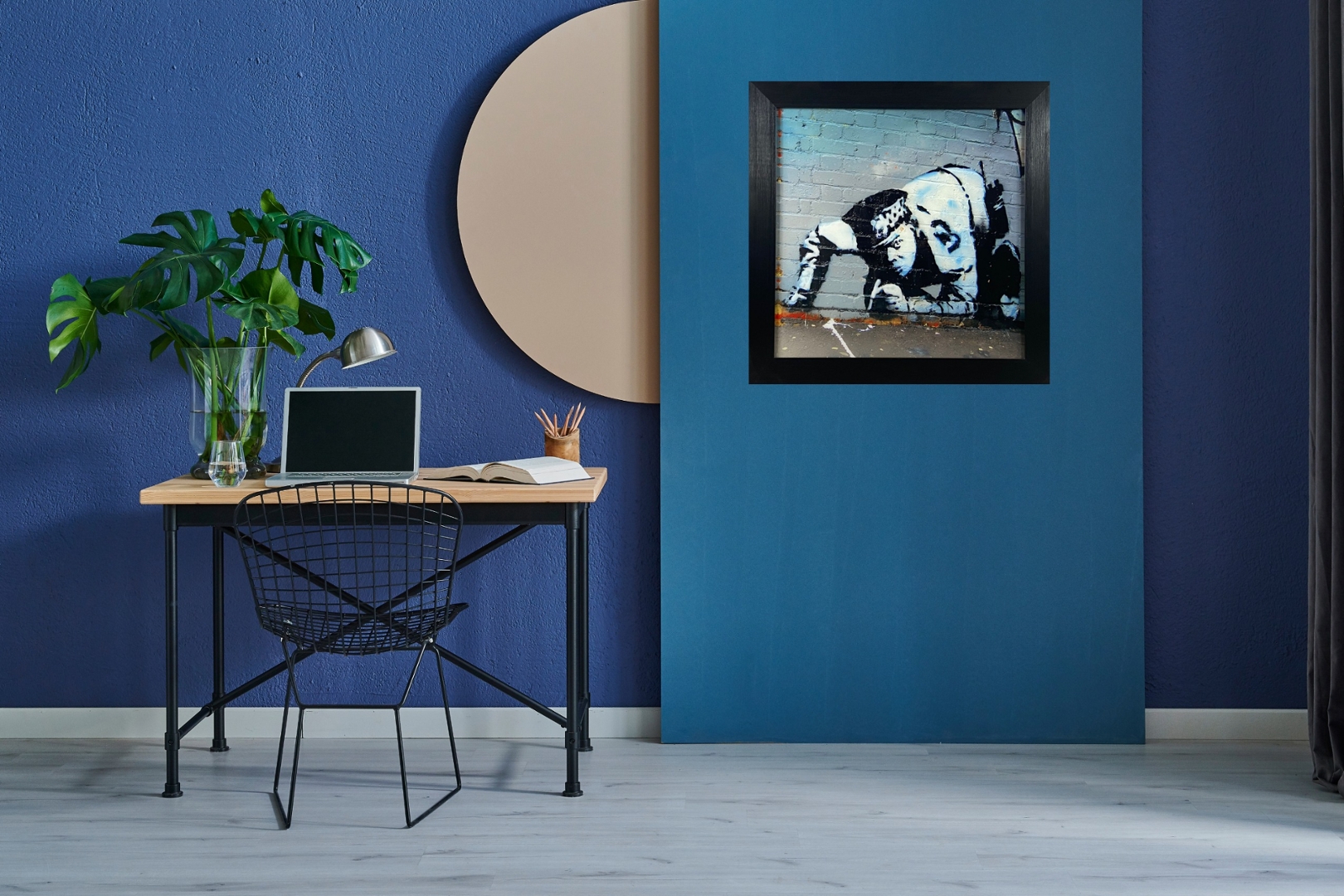With its dimensions of 34 inches in height and 34 inches in width, "Snorting Copper" commands attention and invites viewers to engage with its provocative message and social commentary. The black frame not only enhances the artwork's presentation but also underscores its thematic complexity and visual impact. Through this piece, Banksy encourages viewers to critically examine issues of authority, accountability, and the blurred lines between legality and morality, making it both visually compelling and intellectually stimulating.